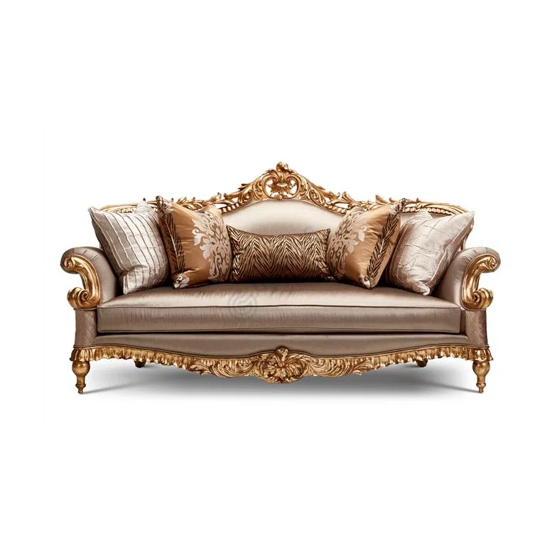 This armchair embodies the elegance of the Art Deco period. It features a beautifully carved solid wood frame with a rich gold finish, highlighting its ornate details and classic silhouette. The soft textile upholstery in a warm, neutral tone complements the intricate woodwork, creating a look of sophisticated luxury.