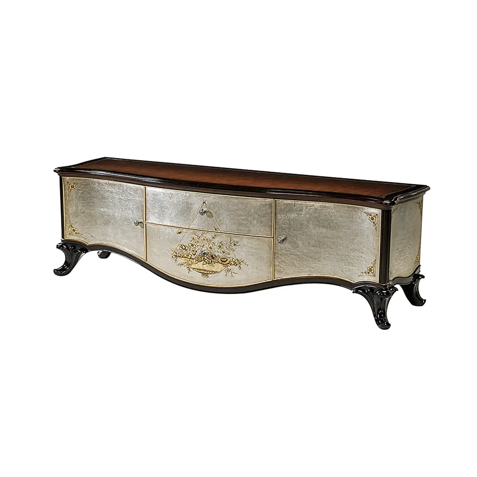 Below the main surface, a gracefully curved lower shelf offers additional space for display or storage. This carefully constructed piece combines aesthetic beauty with practical function, creating an atmosphere of timeless elegance.