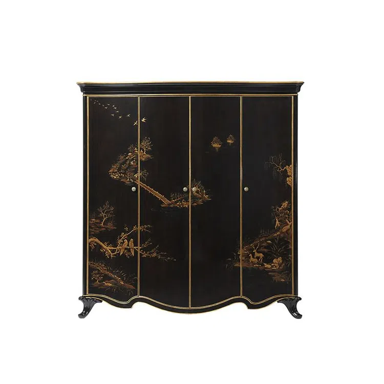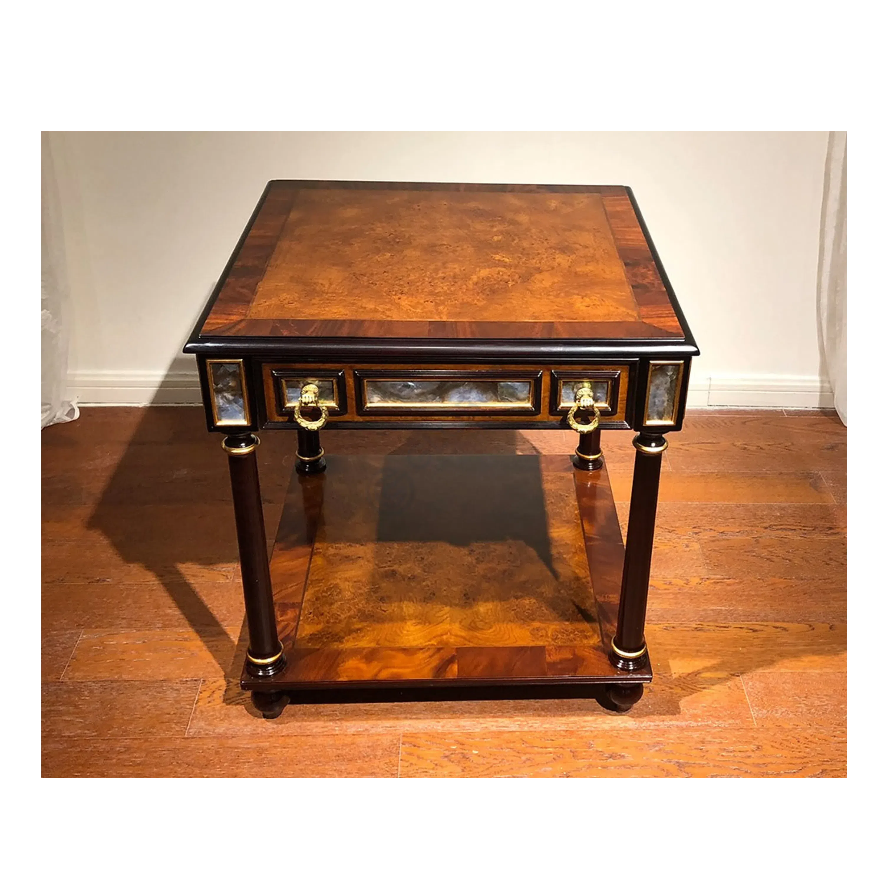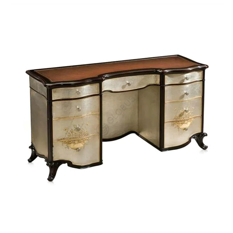 The sides of the table are adorned with intricate decorative panels, featuring a shimmering inlay that catches the light. These panels are interspersed with functional drawers, each fitted with elegant metal ring pulls. The tapered legs are accented with gilded metal details at the top and bottom, enhancing the table's refined appearance.