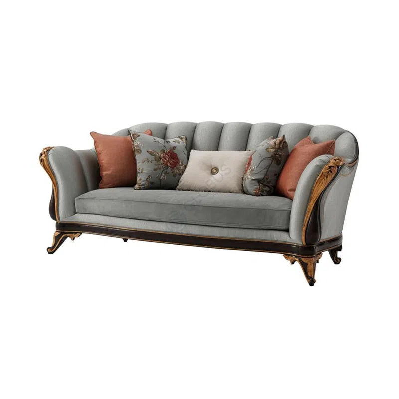 The design features graceful curves that envelop the sitter. Richly carved details adorn the arms and legs, finished with a touch of gold accentuating the dark wood frame. The smooth textile highlights the armchair's classic silhouette, complemented by a decorative floral cushion that adds a touch of pattern.