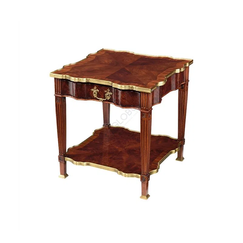 Designed to be both beautiful and practical, this table provides convenient storage and a distinguished surface beside the bed, elevating the room's overall aesthetic with its luxurious materials and timeless style.