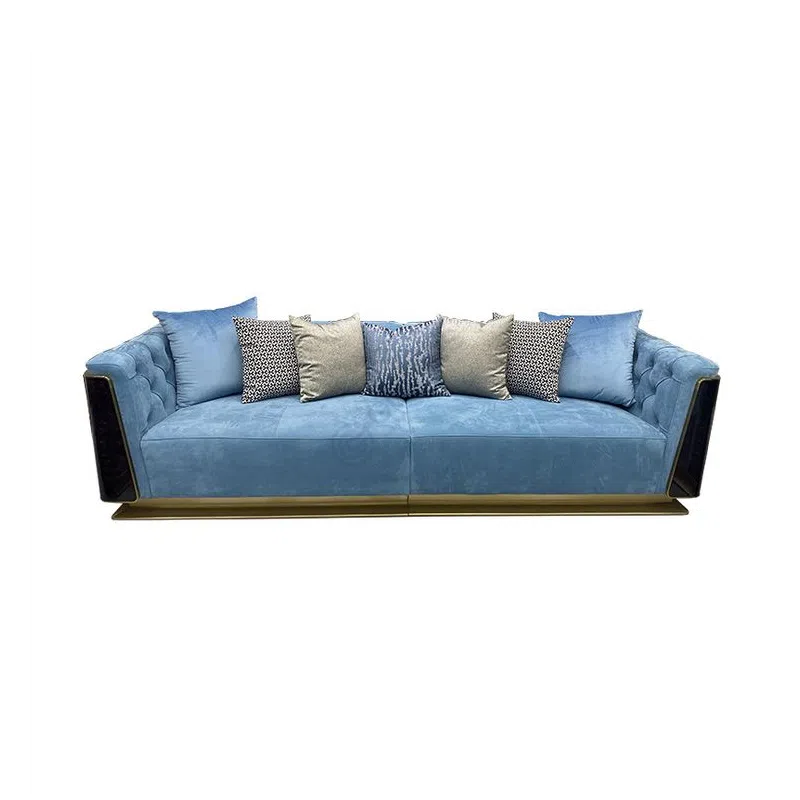 This armchair presents a striking blend of modern design and Art Deco elegance, perfect for a sophisticated living room setting. Upholstered in a soft blue suede leather, it features deep button tufting on the backrest, offering both comfort and a classic visual texture.