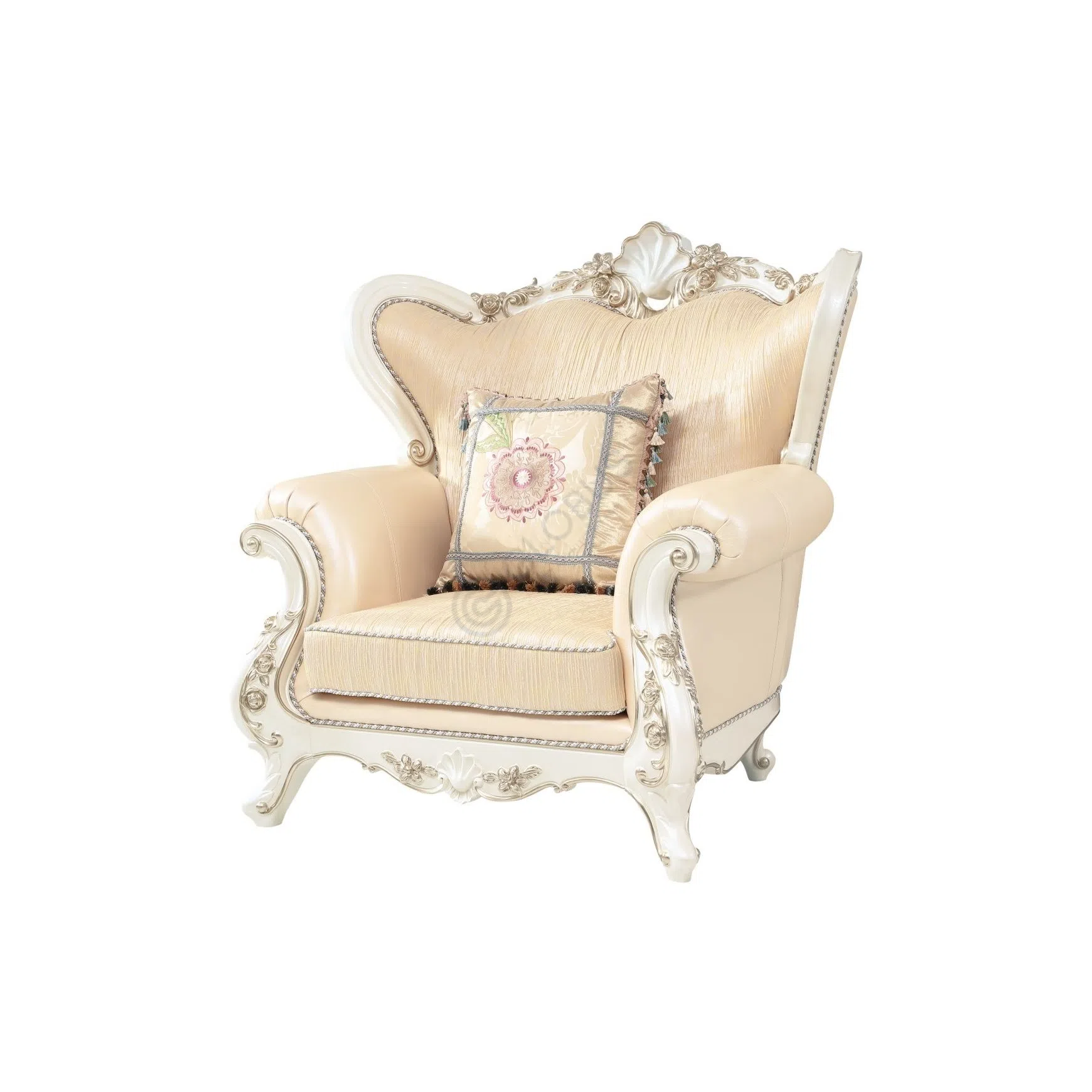 This sofa embodies the elegance of European classic design, drawing inspiration from the Baroque and Rococo eras. Its frame, crafted from solid wood, features graceful curves and delicate carvings finished in a soft, antique hue, lending a timeless charm.