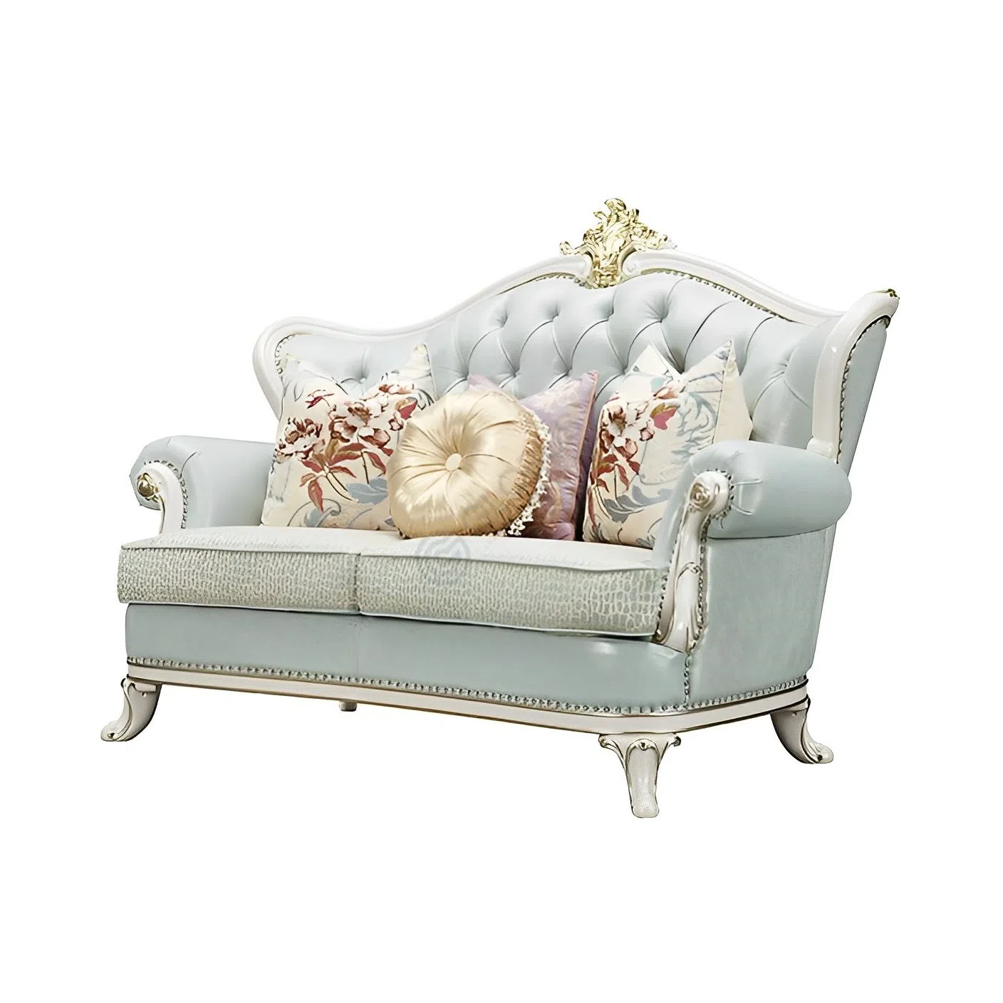 Detailed craftsmanship is evident throughout the piece. The backrest features classic button tufting, enhancing its luxurious feel. Delicate trim and decorative studs line the edges, adding a touch of traditional charm. Intricate gold-toned carving adorns the crest rail and arm fronts, highlighting the chair's opulent design.