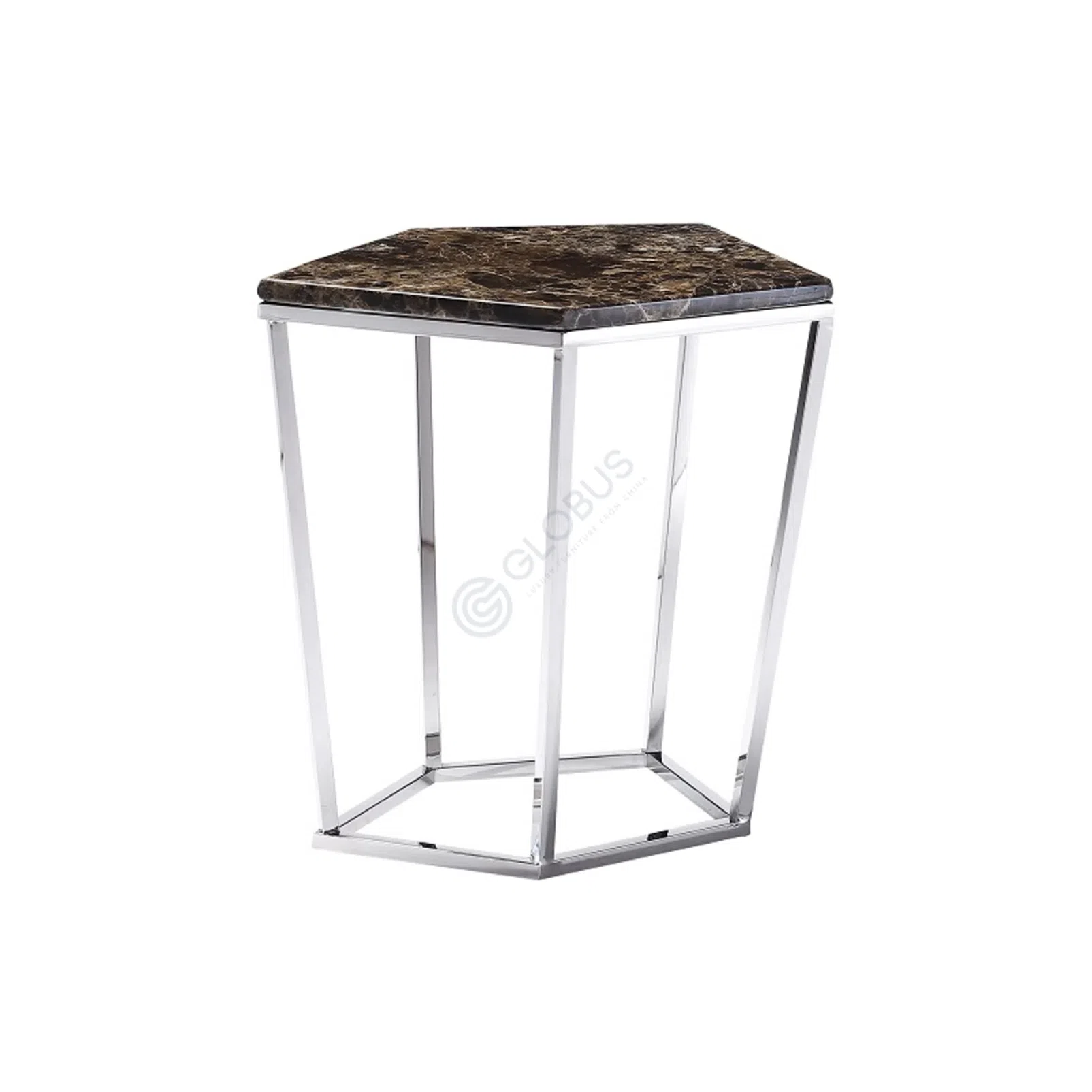 This coffee table features a striking design with a hexagonal artificial marble top set upon a geometrically shaped stainless steel base. The rich, dark tones and natural veining of the marble-effect surface provide a sophisticated contrast to the clean, polished lines of the metal frame.