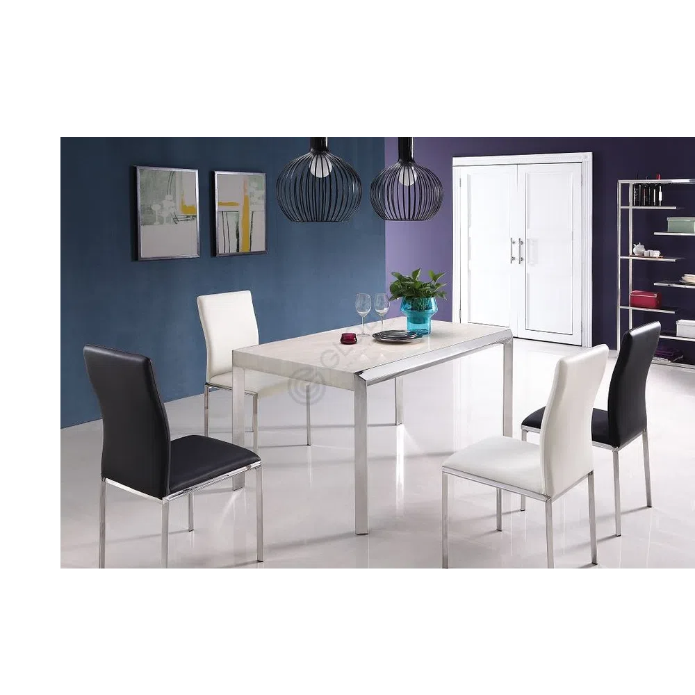 This modern dining chair presents a sleek and refined silhouette. It combines the cool lustre of polished stainless steel legs with a comfortably padded seat and backrest upholstered in smooth PU.