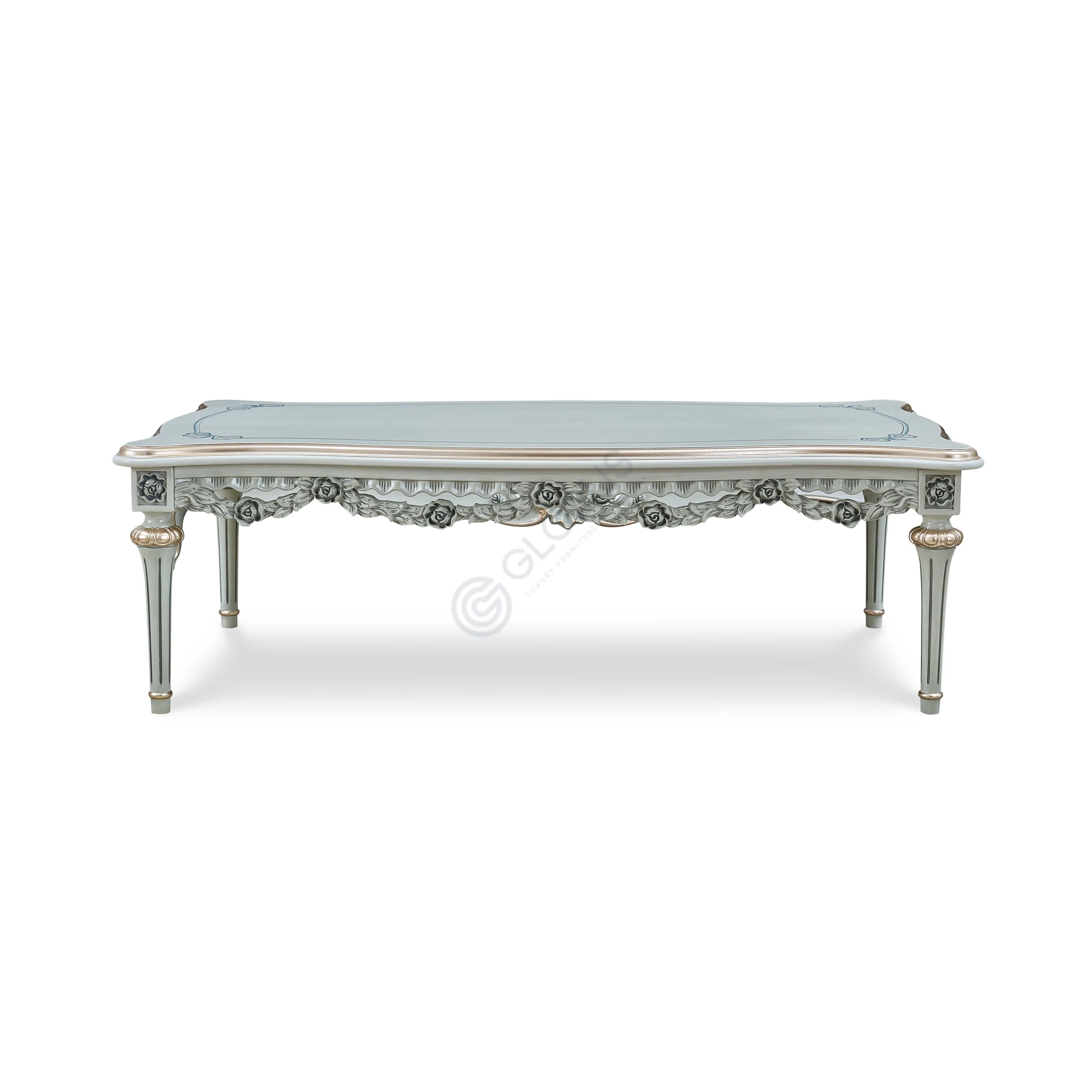 Crafted with exquisite attention to detail, the table features beautifully carved embellishments, including floral motifs and delicate scrolls that adorn the apron. The graceful legs showcase subtle fluting and are topped with decorative accents, complementing the elegant shape of the tabletop. A soft, light finish accented with gilded details highlights the intricate carvings and the subtle decorative pattern on the tabletop surface.