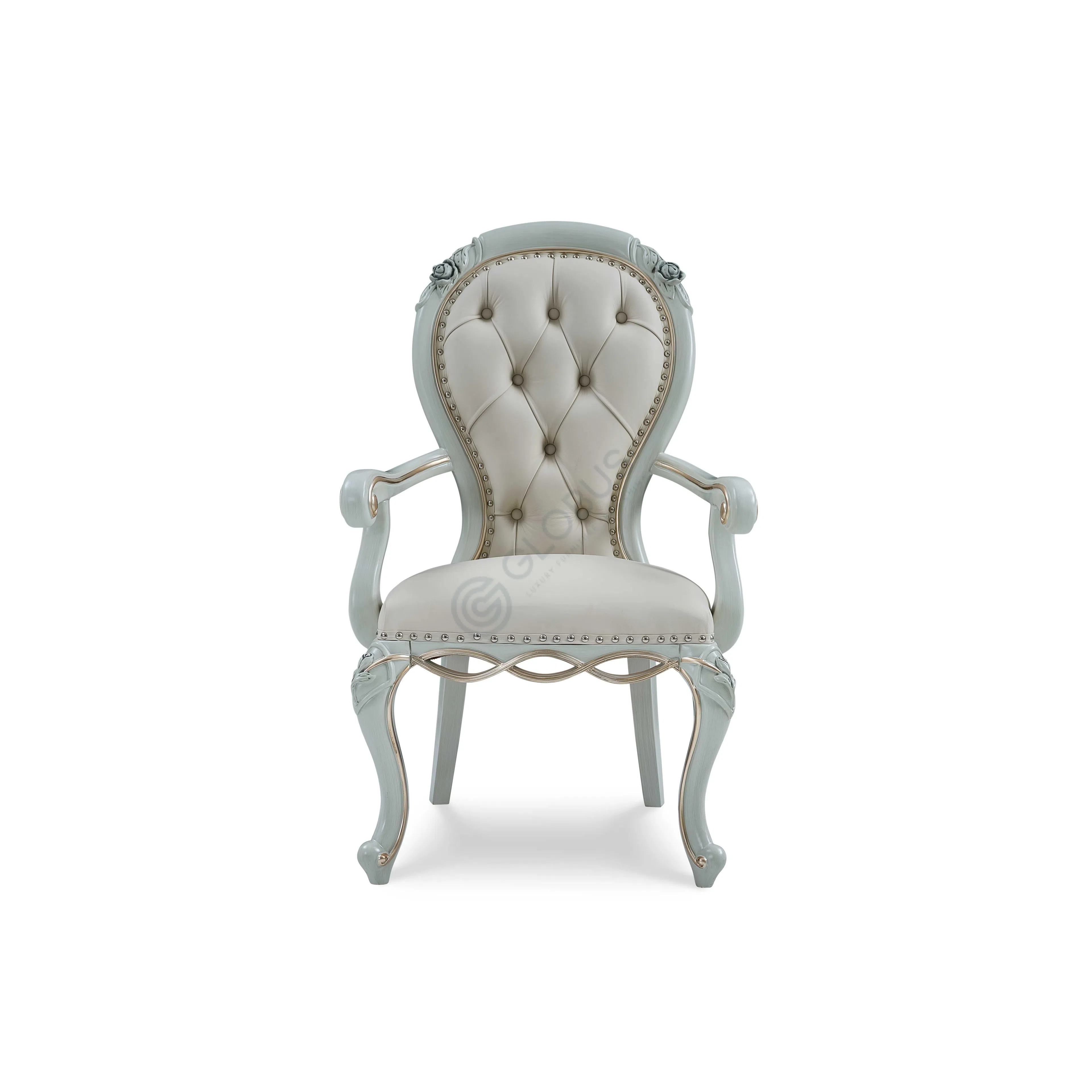 Introducing the elegant and luxurious kitchen chair, crafted from the finest quality leather and solid wood materials. This European classic style chair is perfect for your dining room or kitchen. Created in a stunning light blue and beige color, it is sure to add a touch of sophistication to any living space. Bring comfort and style to your home with this exceptional kitchen chair.