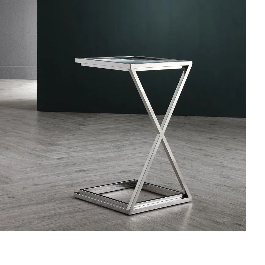 This console table is a striking piece that captures attention with its clean lines and geometric form. The design features a dynamic, intersecting base crafted from polished stainless steel, creating an open and airy structure that offers a modern aesthetic with a hint of Art Deco flair.