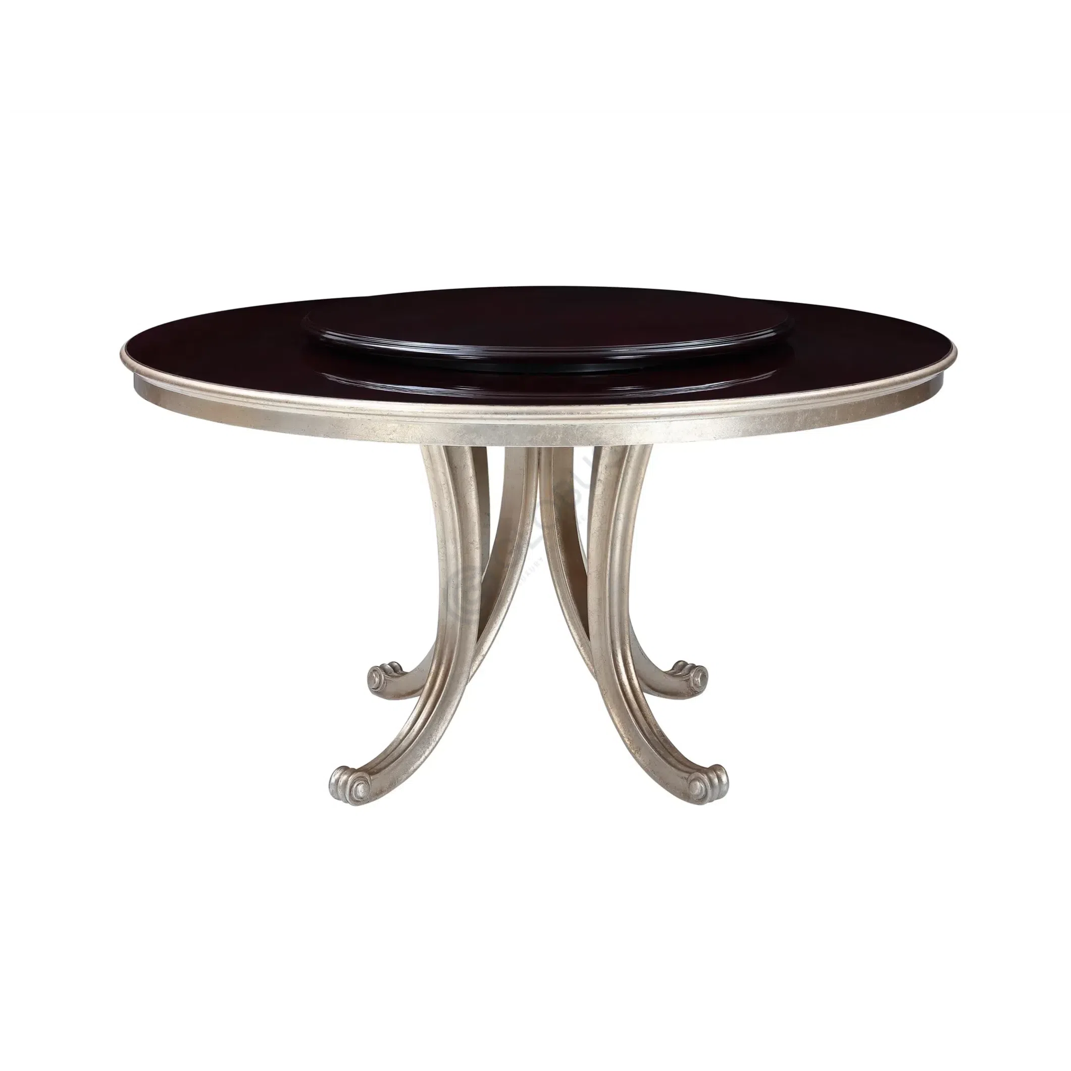 Supporting the top is an elegantly formed base crafted from solid wood and plywood. Four curved legs descend gracefully, detailed with classical fluting. The legs terminate in gently scrolling feet, adding a refined touch to the design.