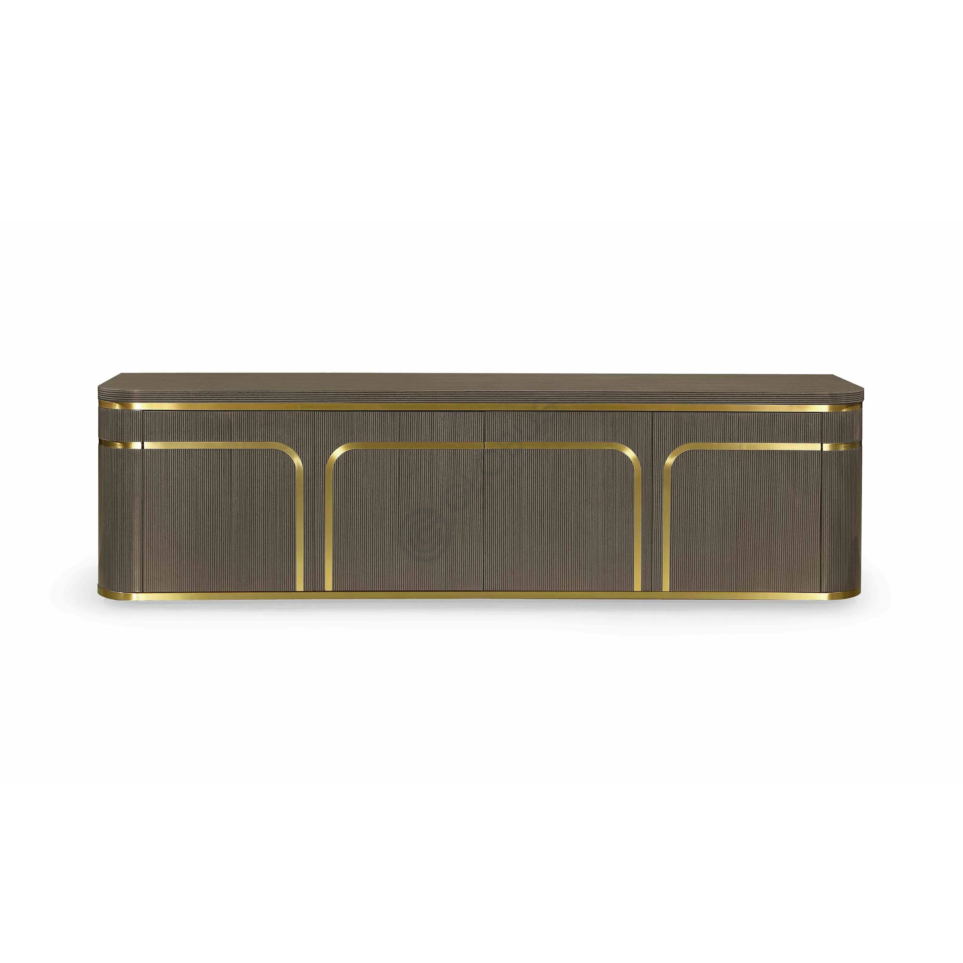 Crafted with natural veneer applied to HDF, the body provides a durable yet refined surface. Striking vertical accents of polished stainless steel in a warm tone frame the corners, adding a touch of luxury and visual structure. This combination of materials creates a harmonious balance between tactile texture and sleek metallic detail.