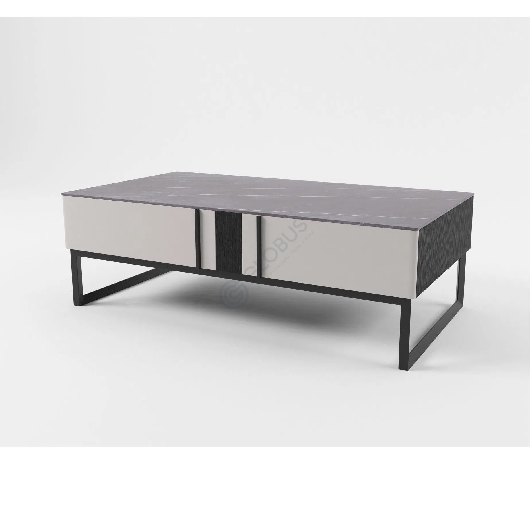 The top surface is crafted from durable sintered stone, providing a sleek and resilient platform. The body, constructed from solid wood and MDF, incorporates a thoughtful mix of storage solutions. This includes concealed compartments behind smooth panel doors and an open shelf section ideal for media devices or display items. The entire structure is supported by a slim yet sturdy metal base frame, elevating the unit and adding to its light, airy feel.