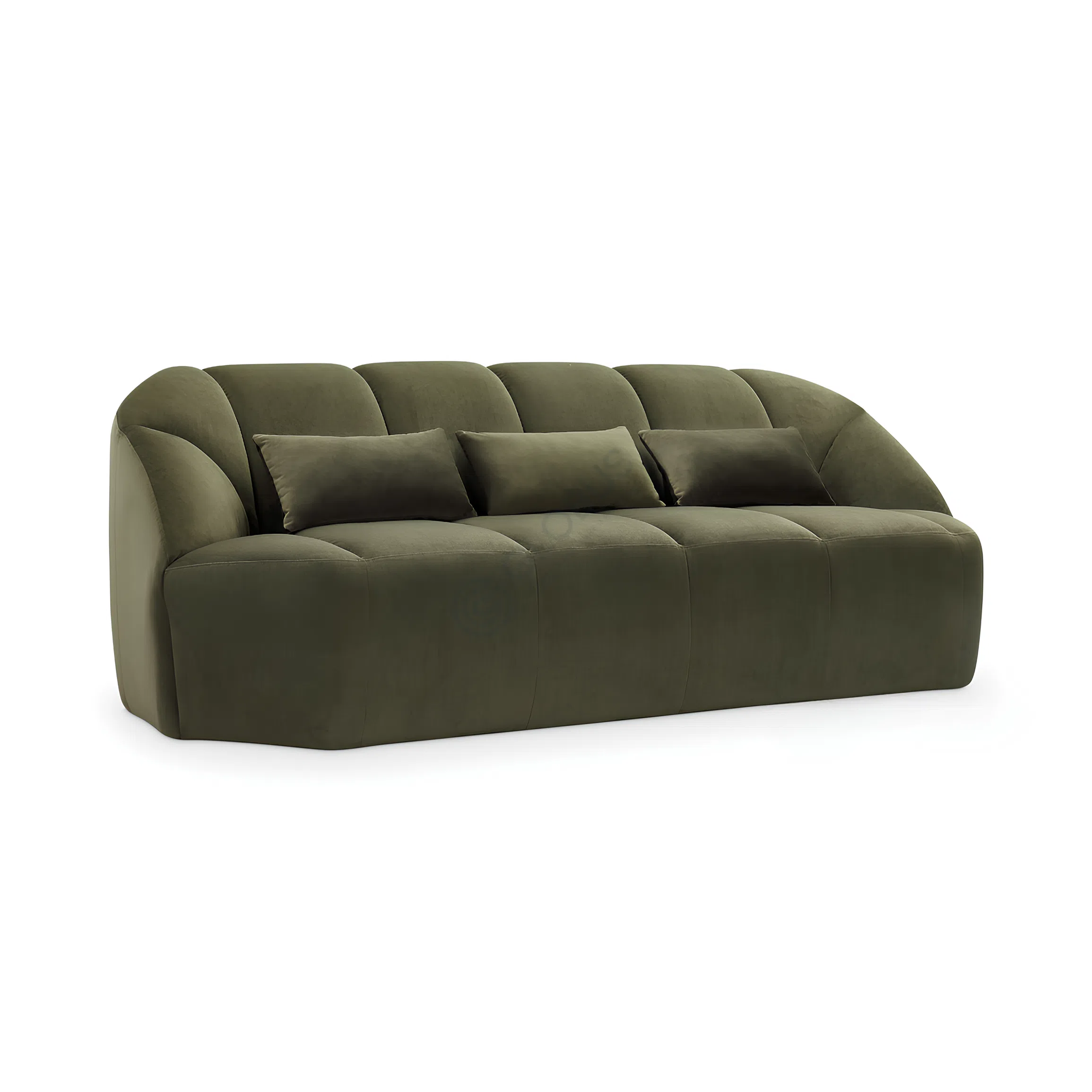 A modern armchair with an enveloping silhouette and generous seat, upholstered in a soft olive textile. Subtle paneling shapes the curved back and integrated arms, while neat topstitching and a coordinating lumbar cushion complete the tailored look.
