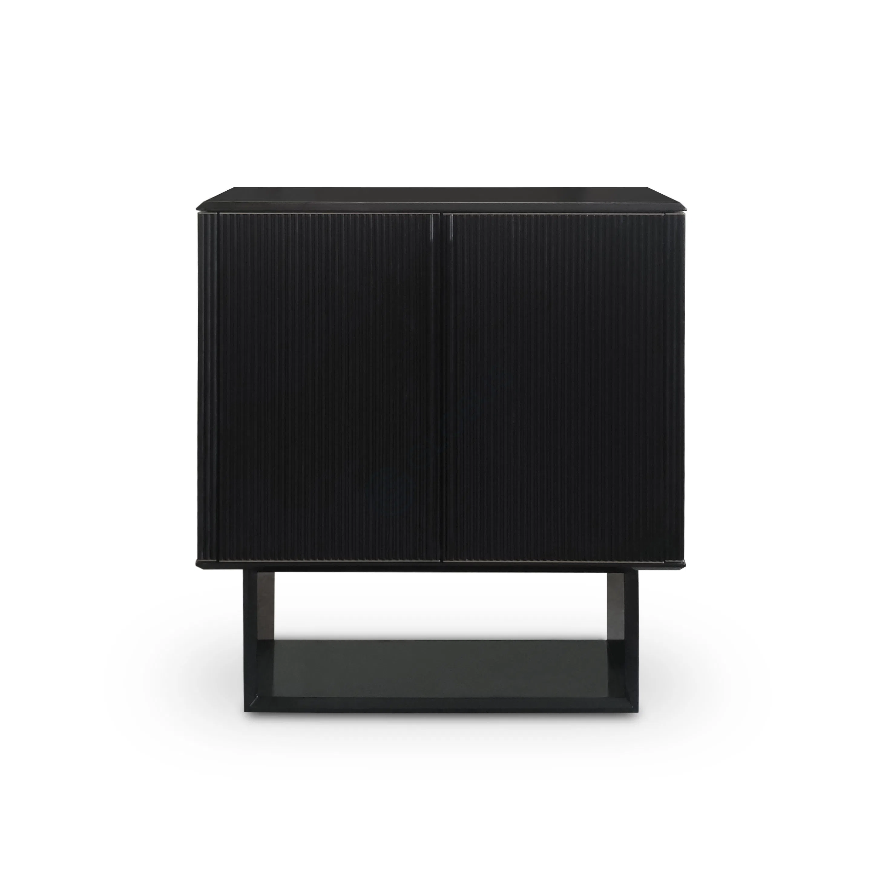 This modern TV stand presents a sleek, low-profile form perfect for contemporary interiors. Its distinct facade features a series of fine vertical ribs across the doors, adding subtle texture and visual interest to the solid black surface. The minimalist design and clean lines create an understated yet sophisticated presence in a room.