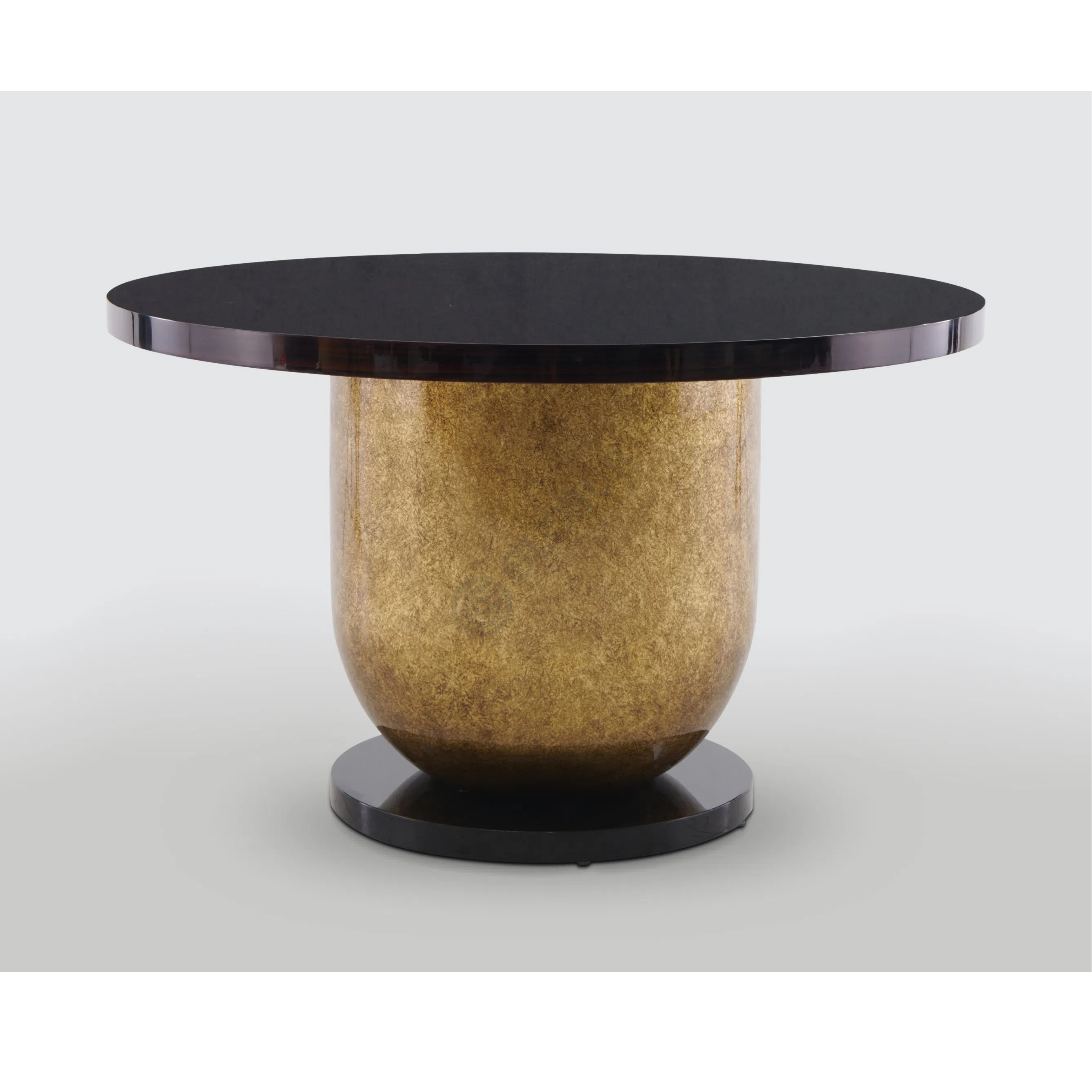 The tabletop and base are finished in a deep, rich black, showcasing the luxurious quality of natural marble. An intricate inlaid detail is centered on the tabletop, adding a unique textural element with a warm, earthy tone. The central pedestal provides a compelling contrast with its radiant gold finish, acting as a bold focal point for the entire piece. The construction incorporates fine materials such as solid wood, natural veneer, and plywood, ensuring both beauty and durability.