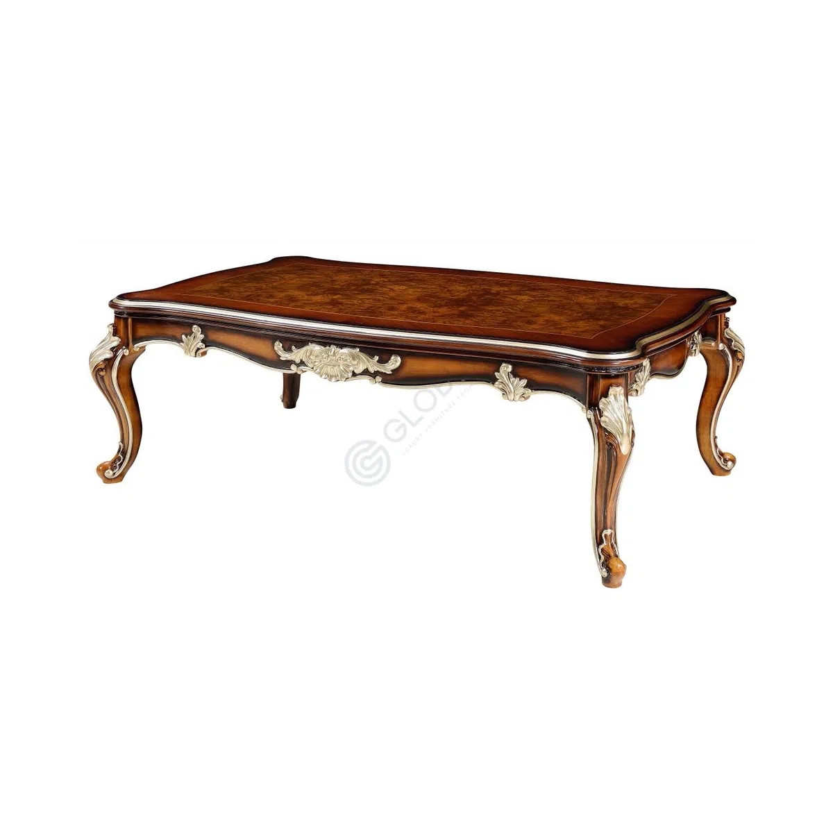 The table features a circular top with a detailed inlay pattern, offering a surface that is both beautiful and practical. Below, the apron and elegant cabriole legs are adorned with intricate carvings, highlighted by a delicate patina finish that accentuates their form and adds a touch of timeless charm.