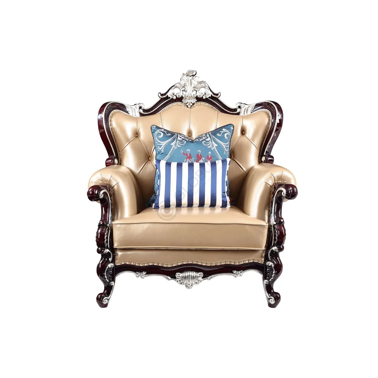 An elegant statement piece for the living room, this sofa embodies European classic design. Its gracefully curved silhouette is defined by a beautifully carved solid wood and plywood frame, finished with a tasteful patina that highlights the intricate detailing. The rich, smooth upholstery covers the seat and back, which features refined button tufting, offering both visual appeal and a structured look.