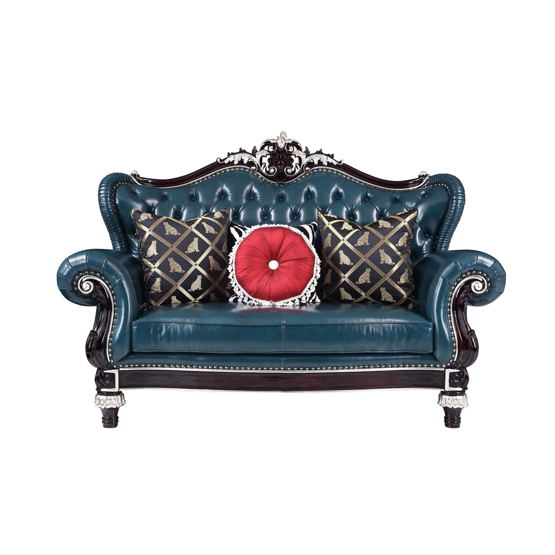 Introducing the exquisite European classic armchair, designed to elevate your living room's décor. Crafted from premium solid wood, this armchair exudes elegance and durability. The seating is upholstered in luxurious leather and soft textile in a striking blue hue, making it a sight to behold. Its beautiful mahogany finish enhances the armchair's charm, making it a standout piece. Place it in your living room and bask in its comfort while admiring its regal beauty.