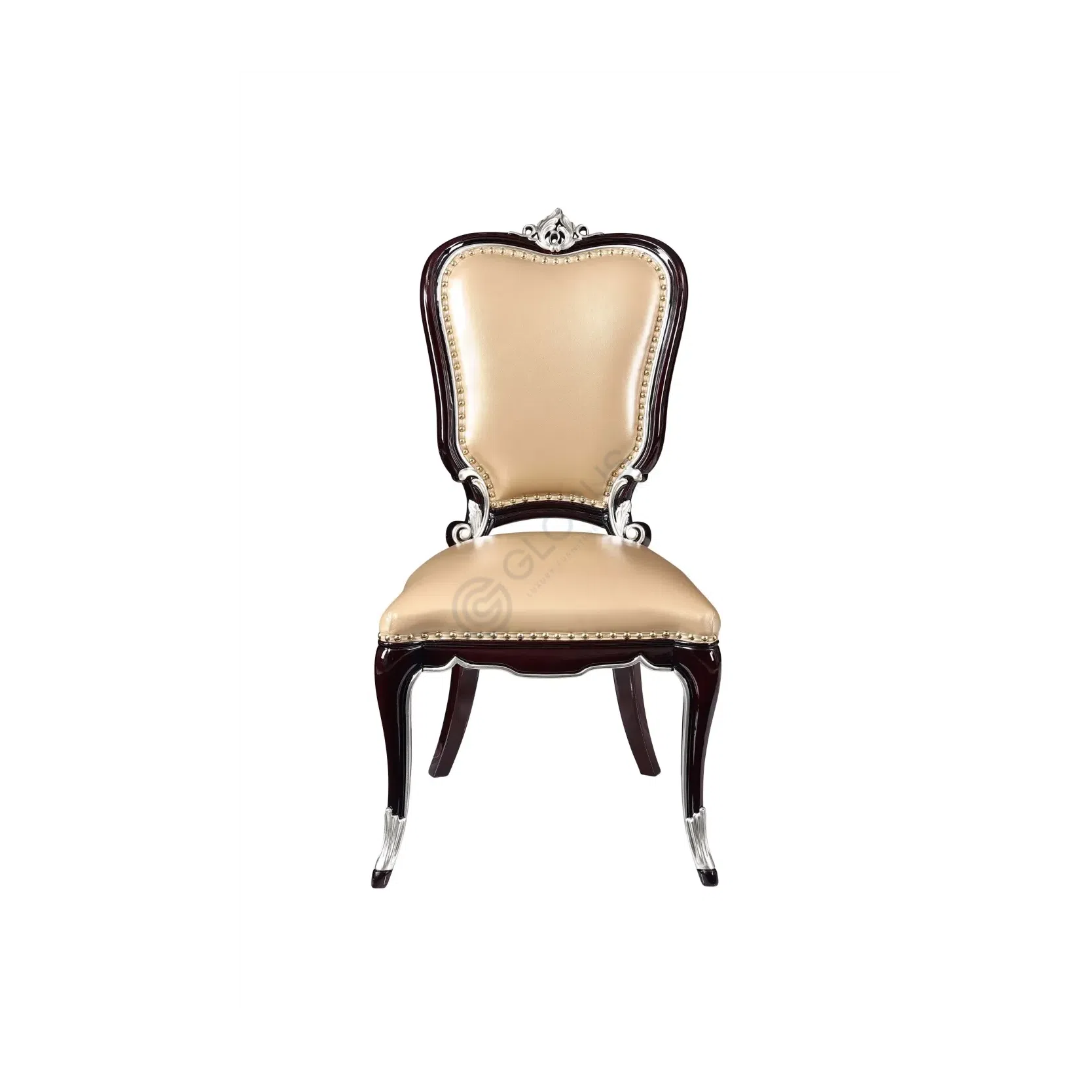 Introducing an exquisite European classic kitchen chair that embodies sophistication with a touch of warmth. Crafted with a solid wood frame for sturdiness and durability, and upholstered with microfiber leather for a soft and luxurious feel. The elegant design features intricate details that exude timeless charm, and the warm walnut finish perfectly complements the soft beige hue of the seat. This versatile chair is ideal for both dining room and kitchen use, adding a touch of refinement to any gathering.