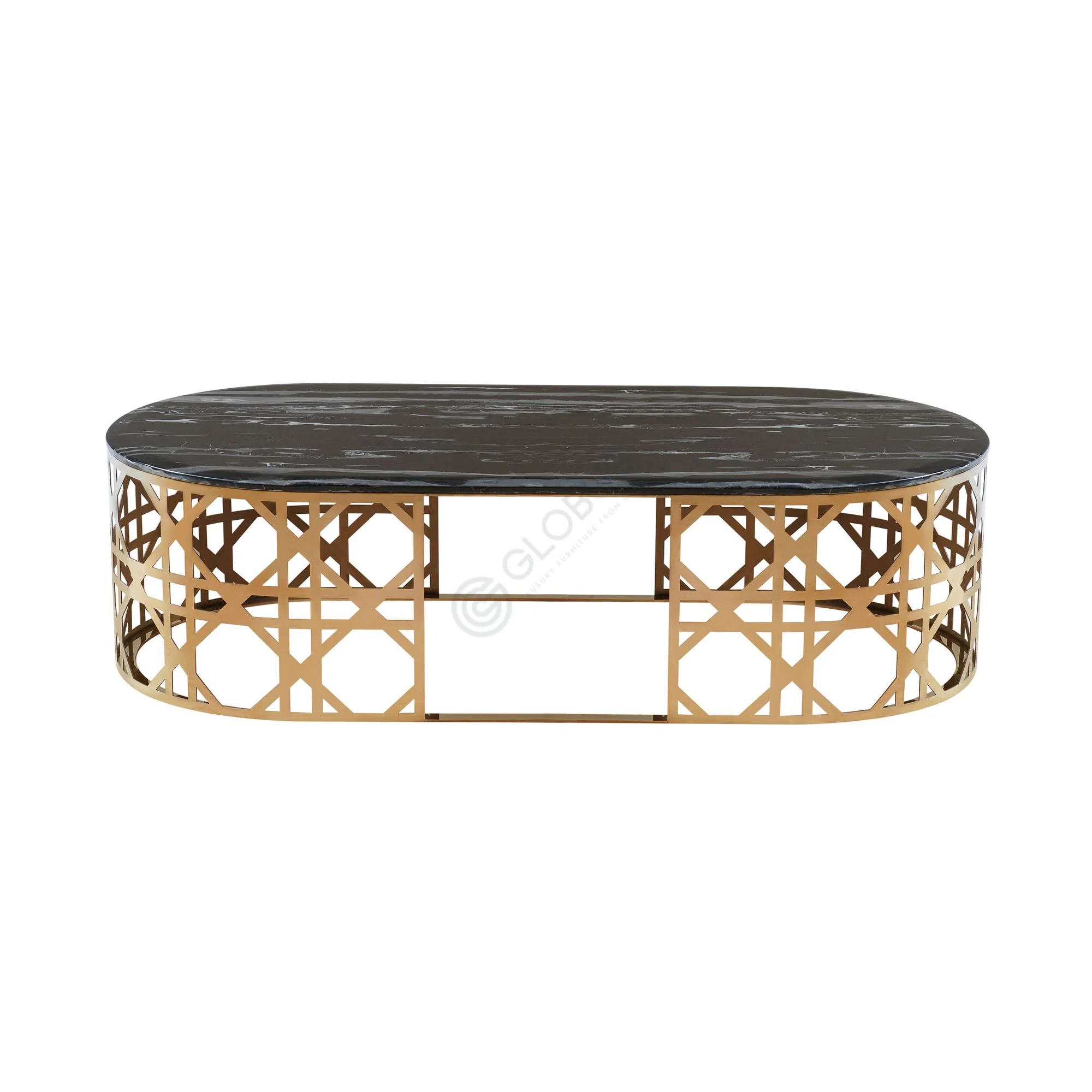 This elegant side table features a striking black natural marble top, perfectly complemented by a gleaming golden stainless steel base. It offers a blend of luxurious materials and a refined design, making it a distinctive addition to any living room.