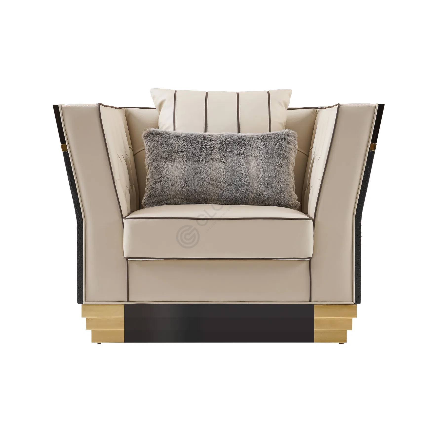 This modern sofa introduces a touch of elegance and comfort to any living room. Its sleek design features clean lines and a refined silhouette, making it a sophisticated centrepiece in a contemporary setting.