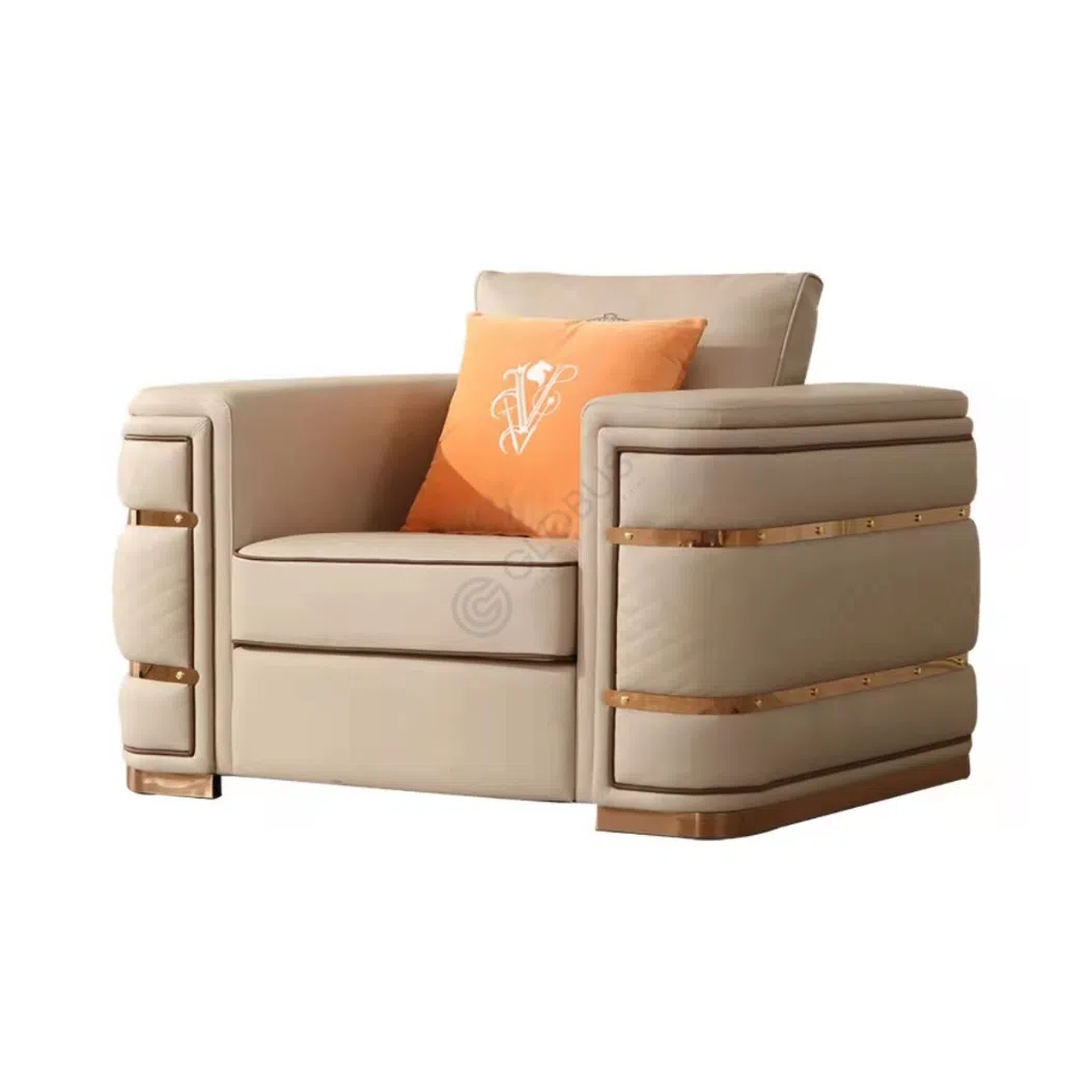 Distinctive design elements enhance its contemporary appeal. The tailored armrests feature a unique quilted texture, accented by elegant horizontal metal details that catch the light. It is completed with a set of plush cushions, adding layers of comfort and a subtle contrast in texture and color.