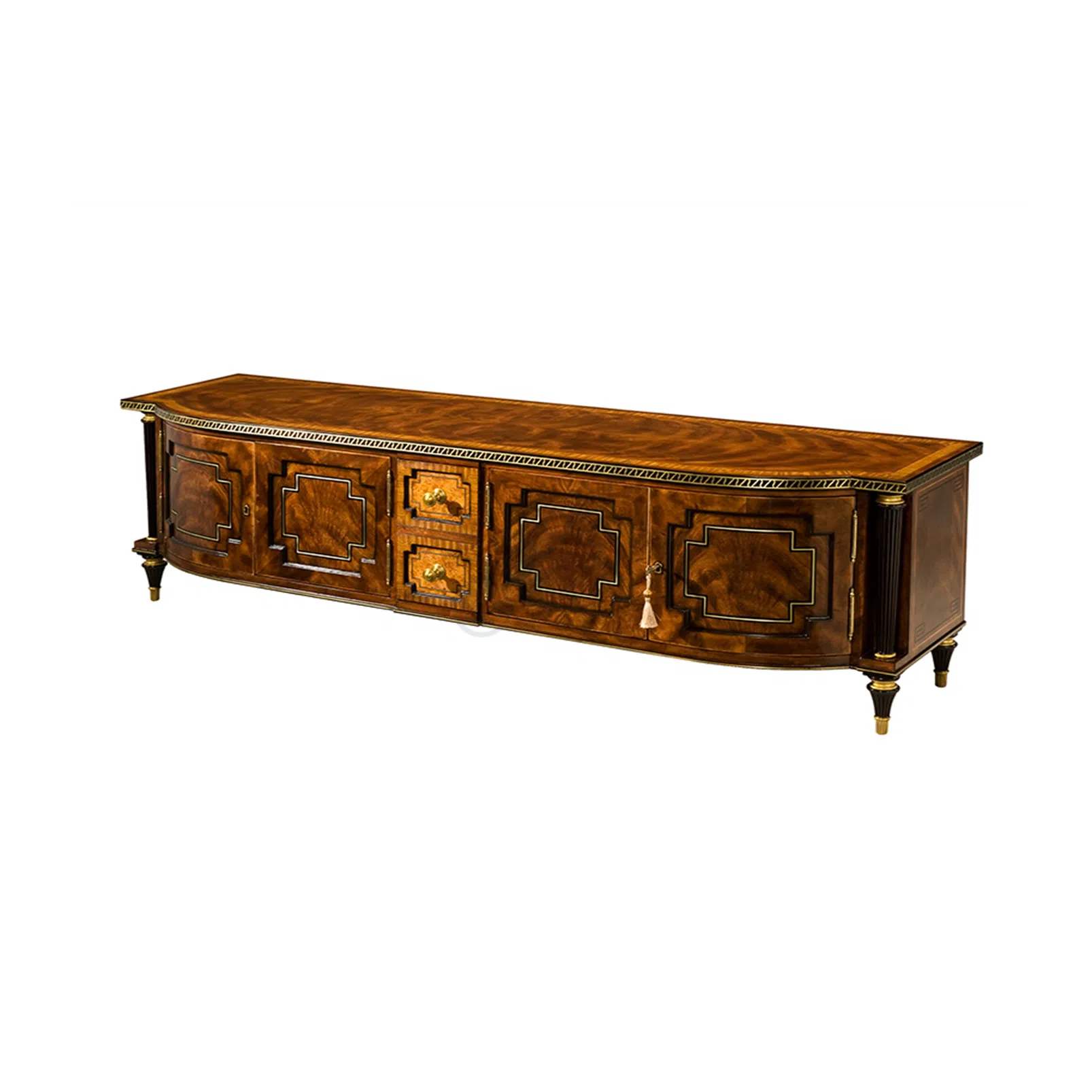 The elongated, curved top features a distinct border inlay that accents its shape. Below the tabletop, a subtle apron houses a series of small drawers, providing discreet storage space. These drawers are detailed with decorative pulls, adding to the table's ornate character.