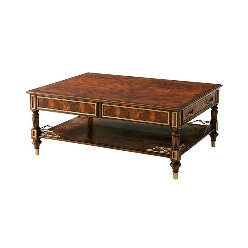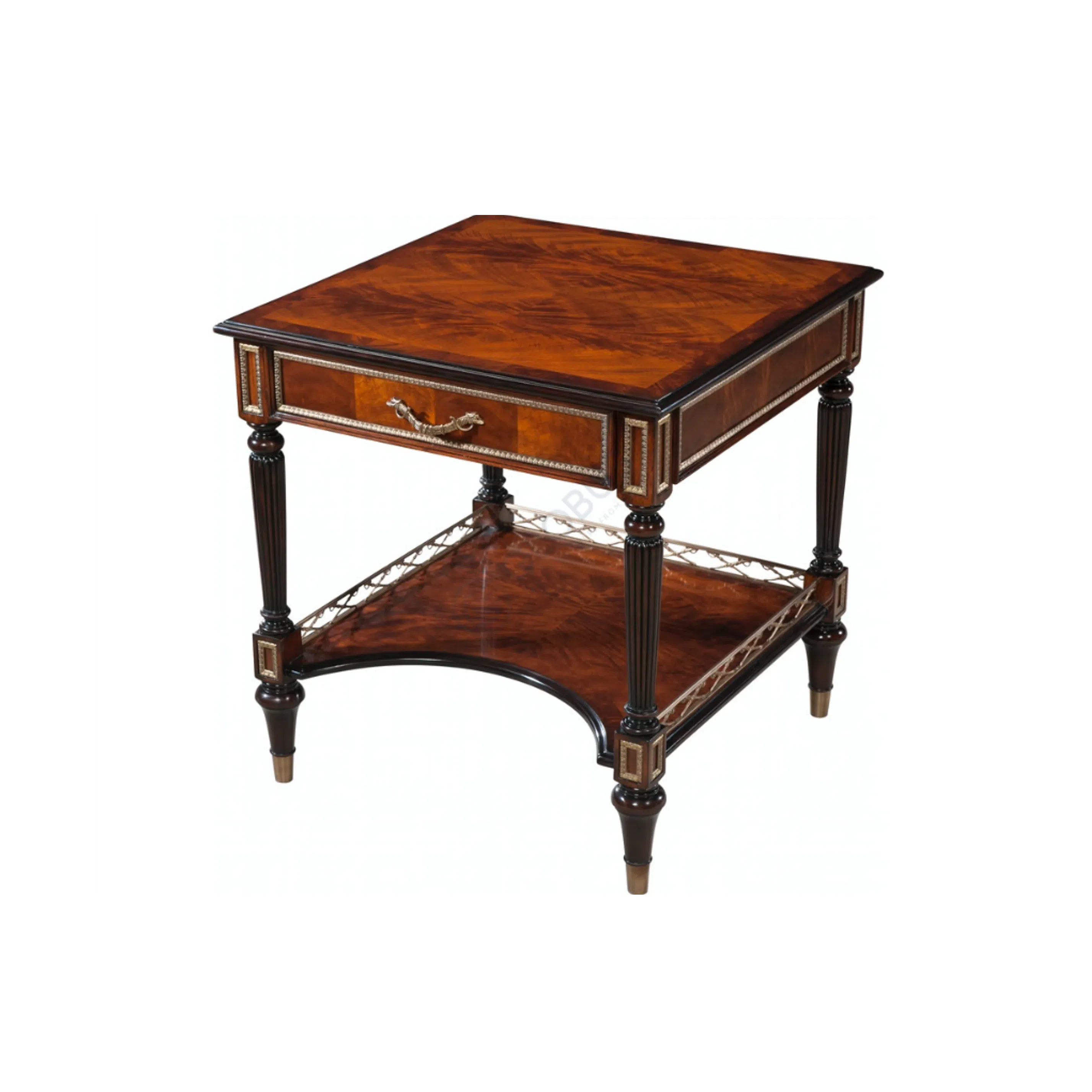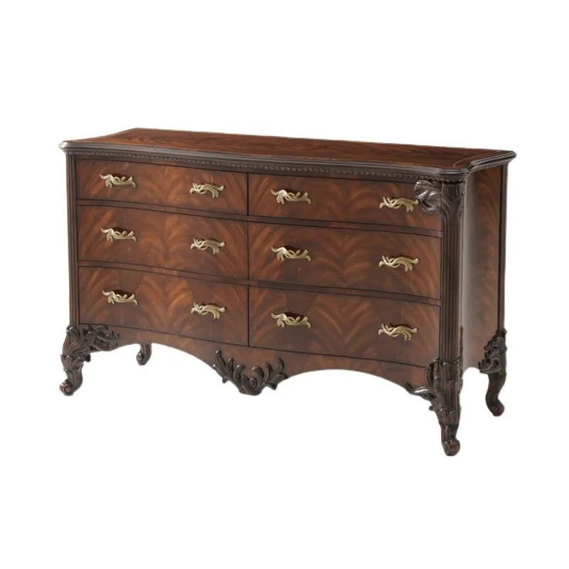 Functionality is offered through multiple drawers, perfect for organizing bedside essentials. Each drawer is fitted with ornate handles crafted from copper, providing a touch of luxurious contrast against the wood finish and completing the classic aesthetic. This piece serves as both a practical addition and a decorative element, enhancing the sophisticated ambiance of any bedroom.