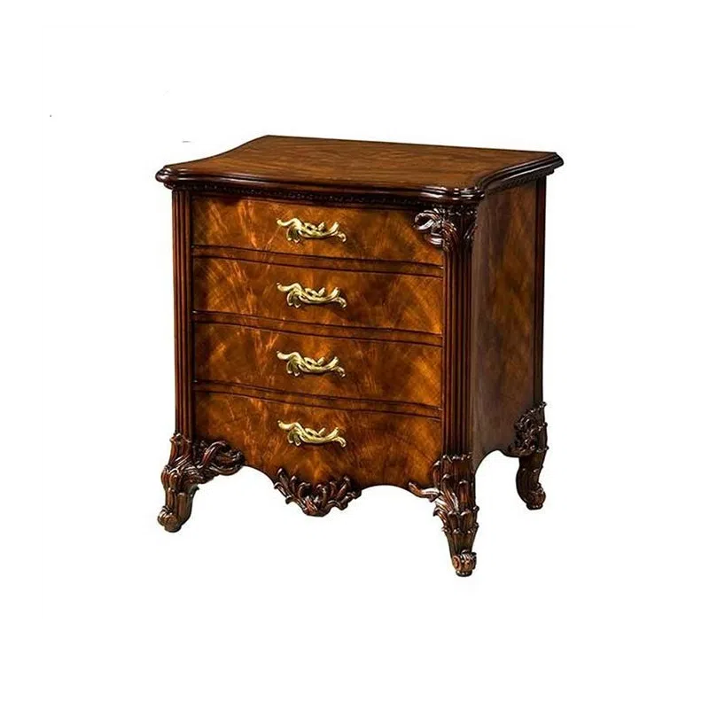 This bedside table is designed to bring classic elegance to the bedroom. Its refined form draws inspiration from European traditional style, featuring graceful curves and finely detailed carvings that speak to artisanal craftsmanship.