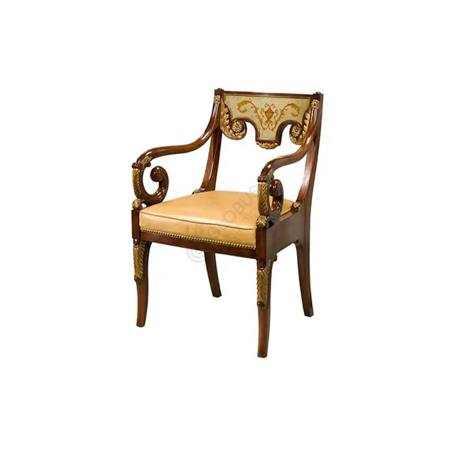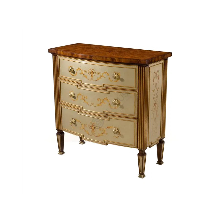 Expertly constructed from solid wood and plywood, the piece features rich wood tones and intricate detailing. Elegant tapered legs, adorned with classical fluting and decorative mounts, provide sturdy support. The apron is embellished with fine painted or inlaid decoration and includes subtle drawers, each finished with delicate copper pulls, offering discreet storage.