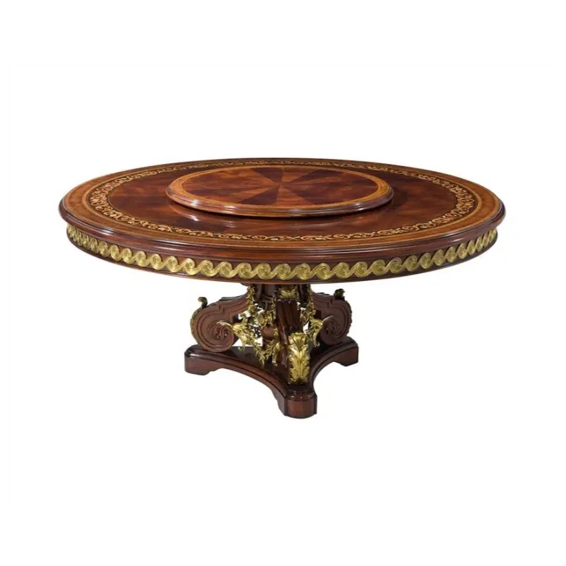 This dining table presents a classic European design, featuring a substantial form crafted from solid wood and natural wood veneer. Accentuated with details in copper and seashell, it offers a rich and decorative presence suitable for formal dining settings.