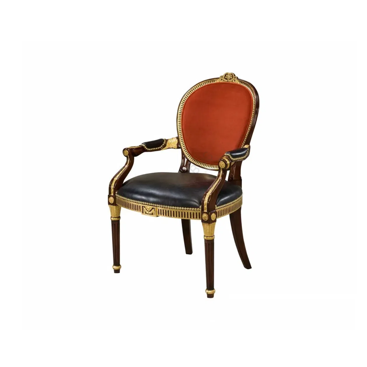 Crafted with a solid wood frame and accented with natural veneer, the chair showcases quality construction. The seat is upholstered in fine leather, offering comfort and durability, while the oval back is covered in a coordinating textile, adding a touch of refined texture. Delicate details finished with a warm patina gold highlight the carving and structure, from the fluted legs to the decorative apron.