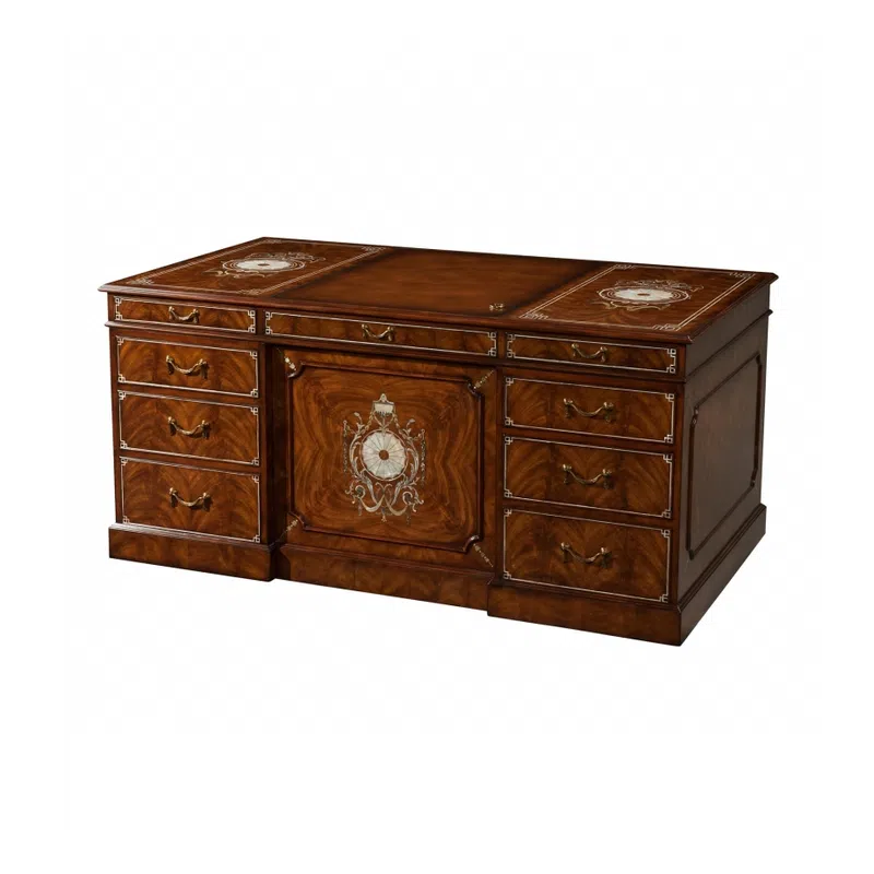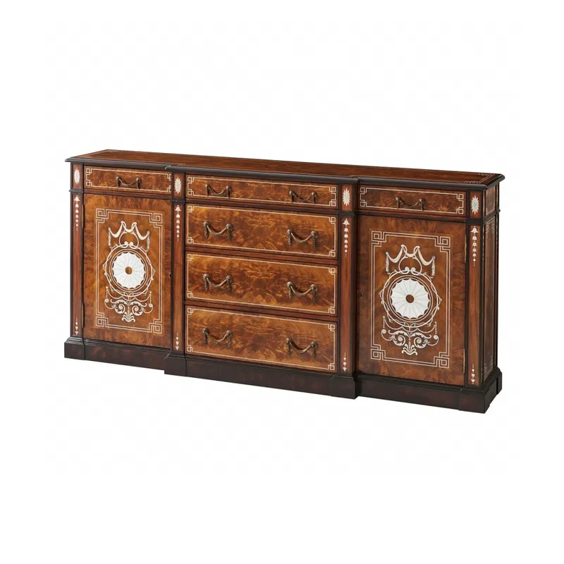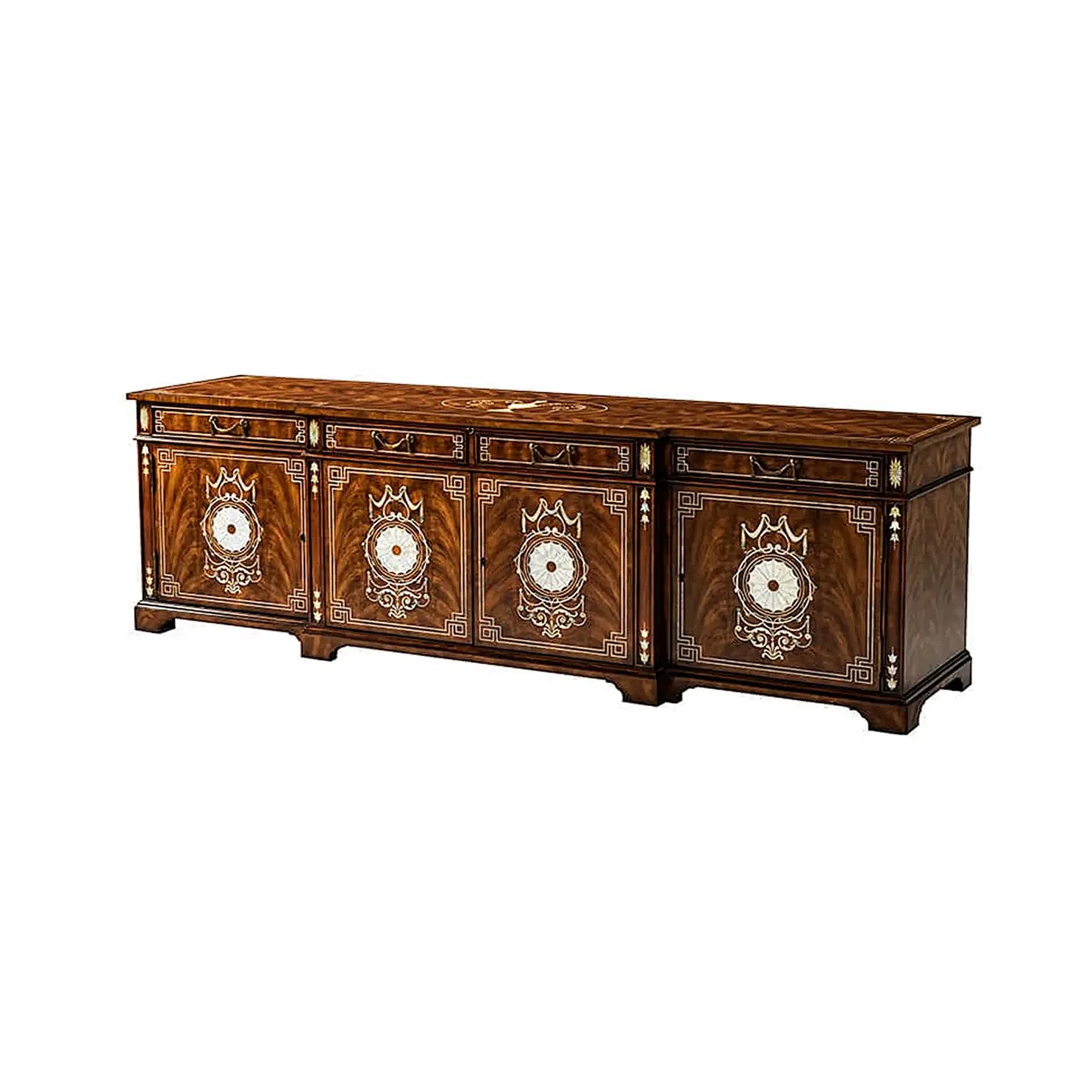 Below, four solid cabinet doors offer concealed storage. The fronts of these doors are adorned with exquisite inlay work, showcasing detailed patterns created with natural veneer, shimmering seashell, and delicate gold foil leaf. Copper elements are subtly integrated into the design, adding another layer of fine detail and craftsmanship to the piece.