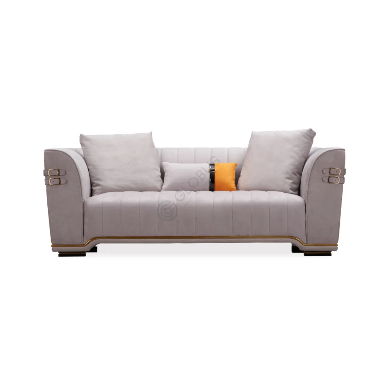 Crafted with plush eco-suede upholstery, the chair features striking vertical channel quilting on the back and inner arm. Distinctive strap details with stainless steel buckles adorn the outer arm, adding a touch of refined detail. A subtle gold-tone trim outlines the base, complementing the overall design. The sturdy construction relies on solid wood and quality stainless steel elements, ensuring both beauty and durability.