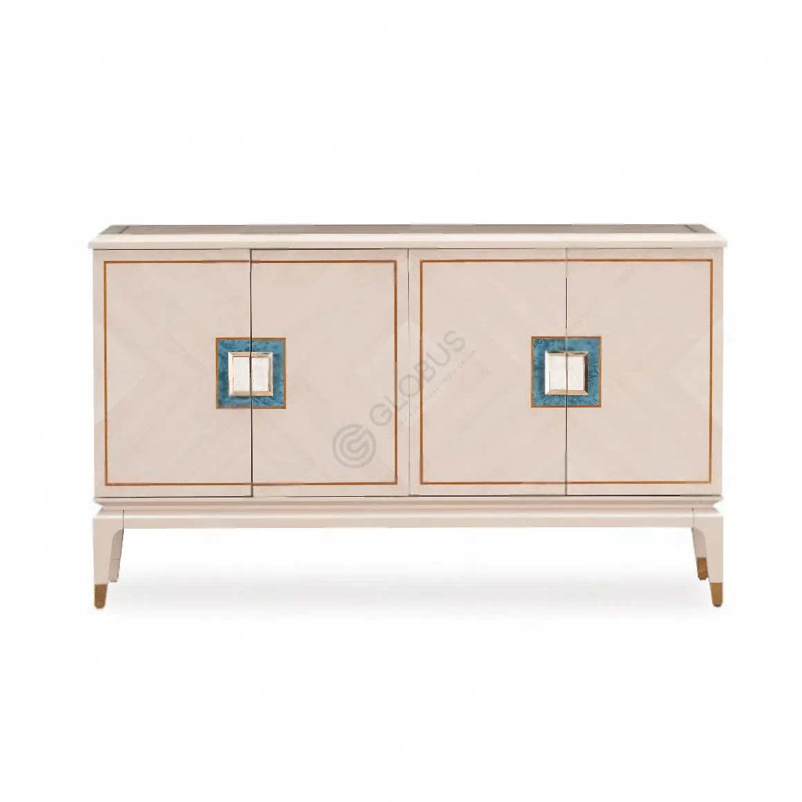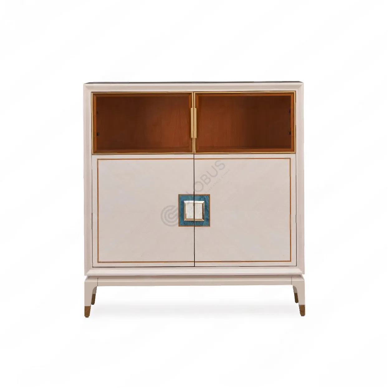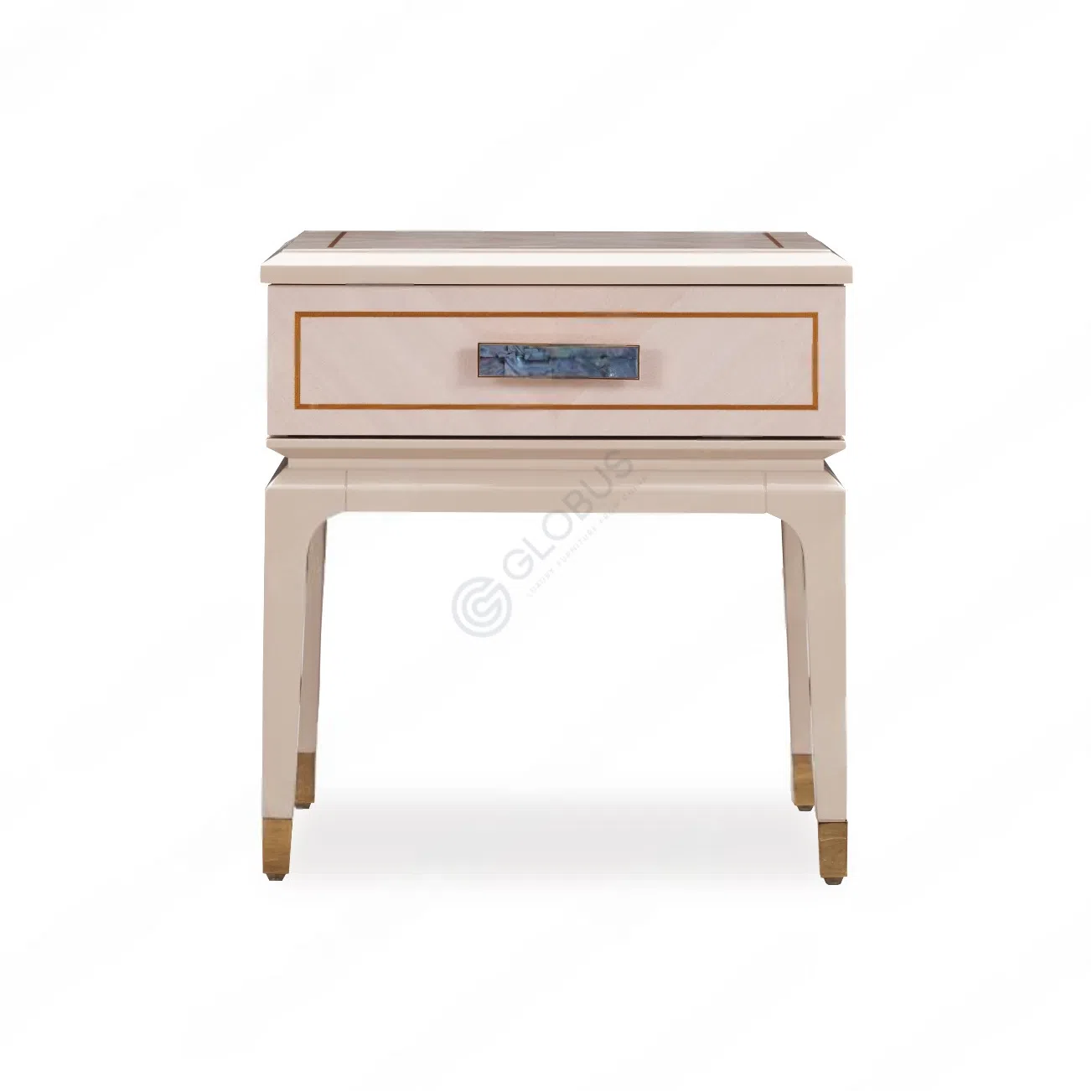 It is constructed using solid wood and plywood, skillfully finished with a natural veneer. The design is elevated by subtle stainless steel detailing, and unique drawer handles inlaid with natural seashell add a distinct, luxurious touch.