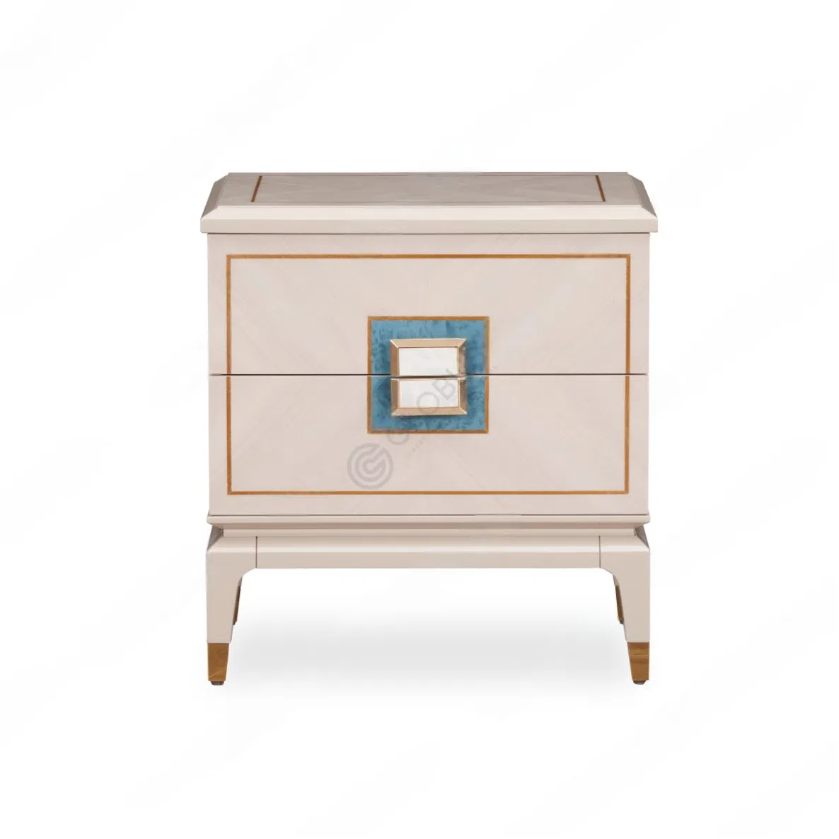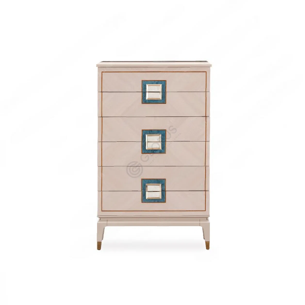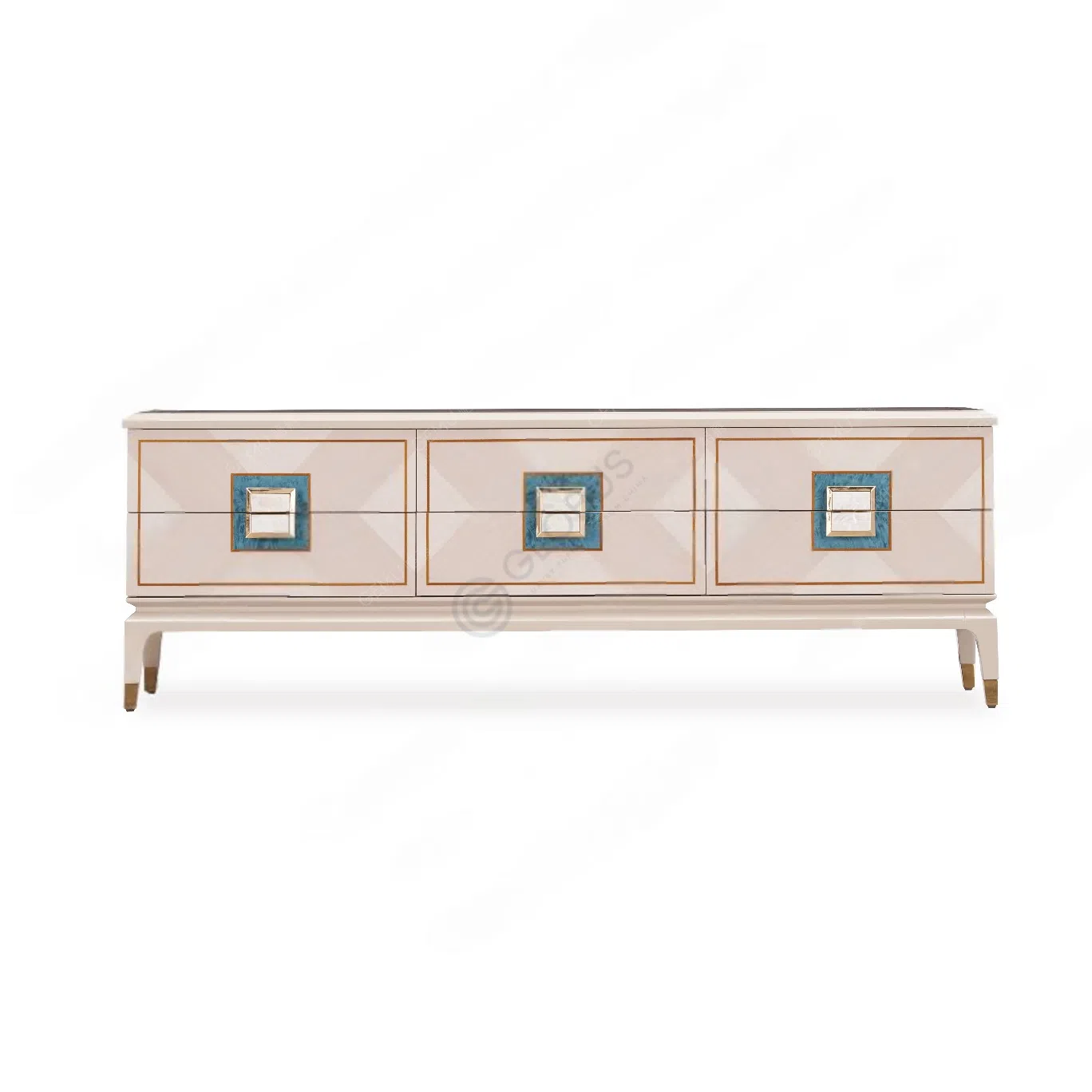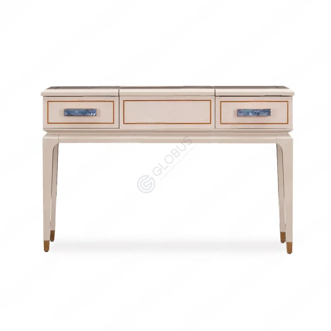 It is constructed using solid wood and plywood, skillfully finished with a natural veneer. The design is elevated by subtle stainless steel detailing, and unique drawer handles inlaid with natural seashell add a distinct, luxurious touch.