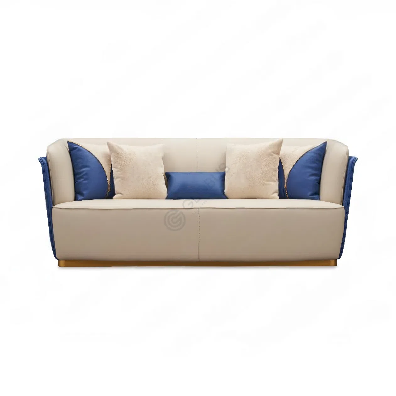 Its design features a beautifully curved back and arms that wrap around the seat, offering a sense of enclosure and comfort. The upholstery presents a refined contrast, combining a soft, neutral tone on the inner seat and back with a rich, quilted blue microfiber leather on the outer shell. A matching lumbar pillow in the same vibrant blue provides additional support and enhances the tailored look.