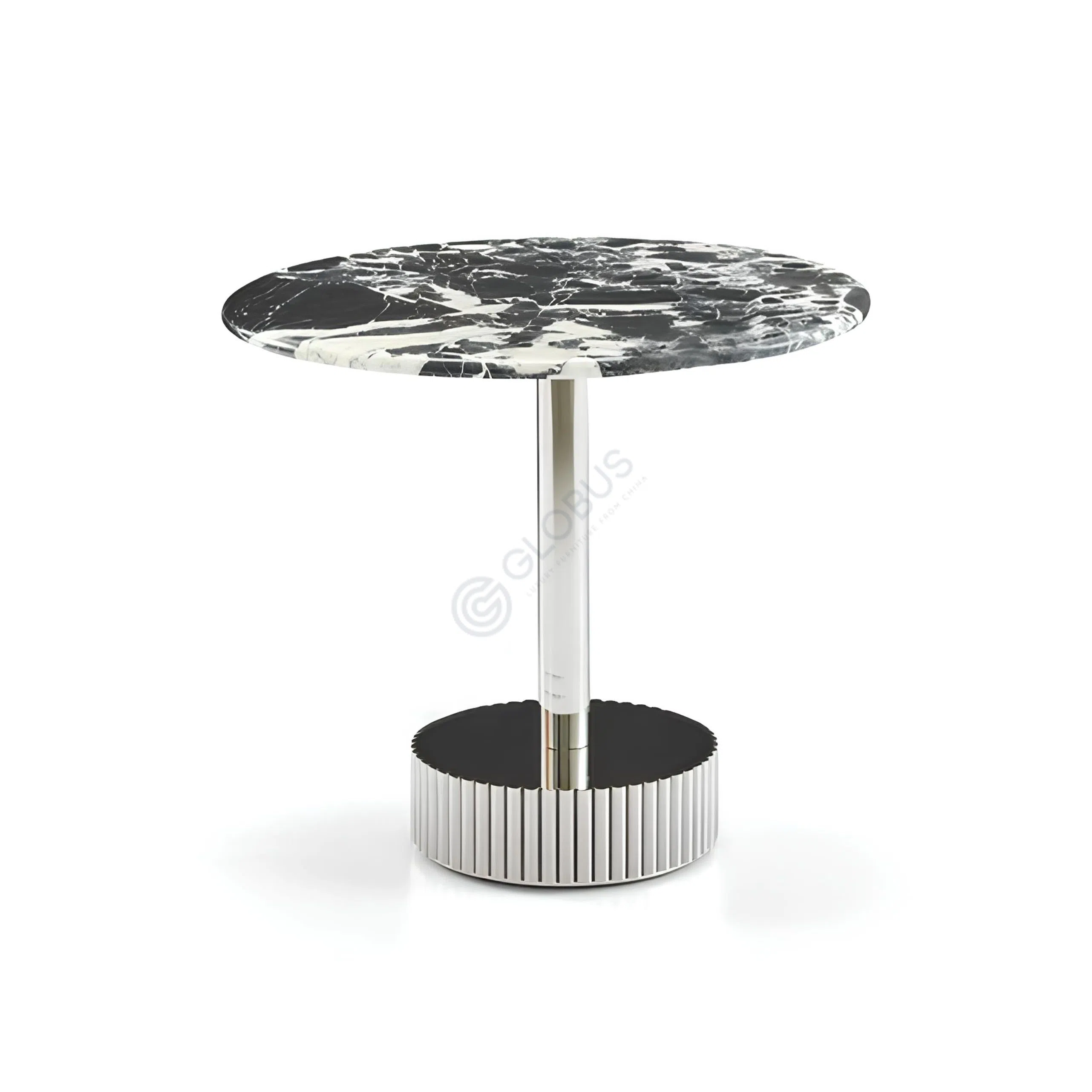A round coffee table topped with natural black-and-white marble rests on a polished stainless steel base. The slim tabletop showcases unique veining that brings subtle contrast to a modern interior. Beneath, a cylindrical column of vertical fluting adds architectural interest without overwhelming the design.