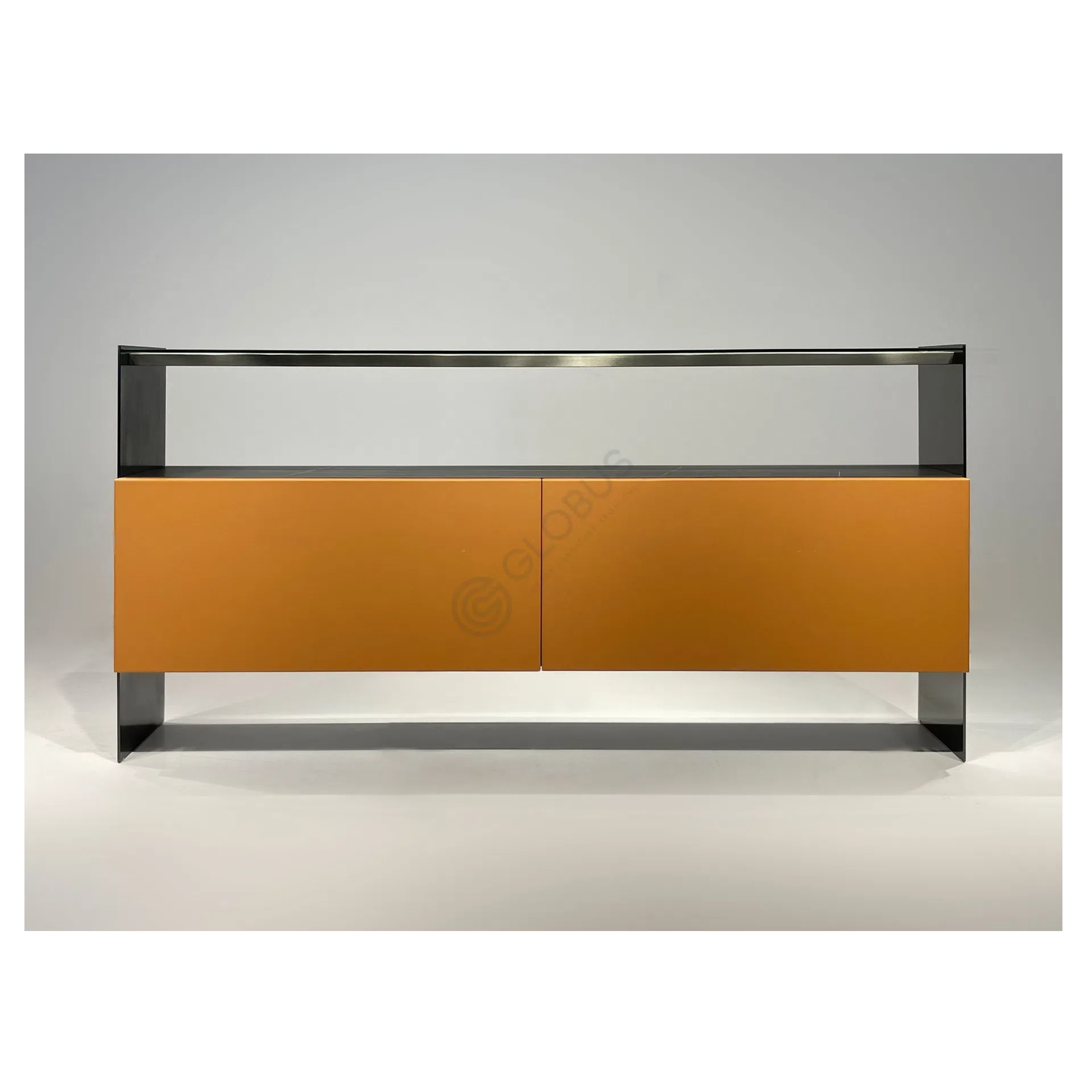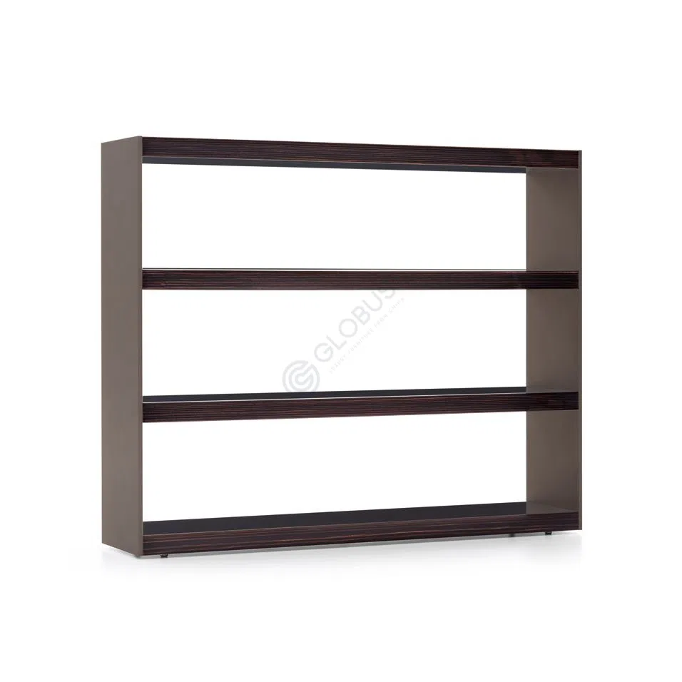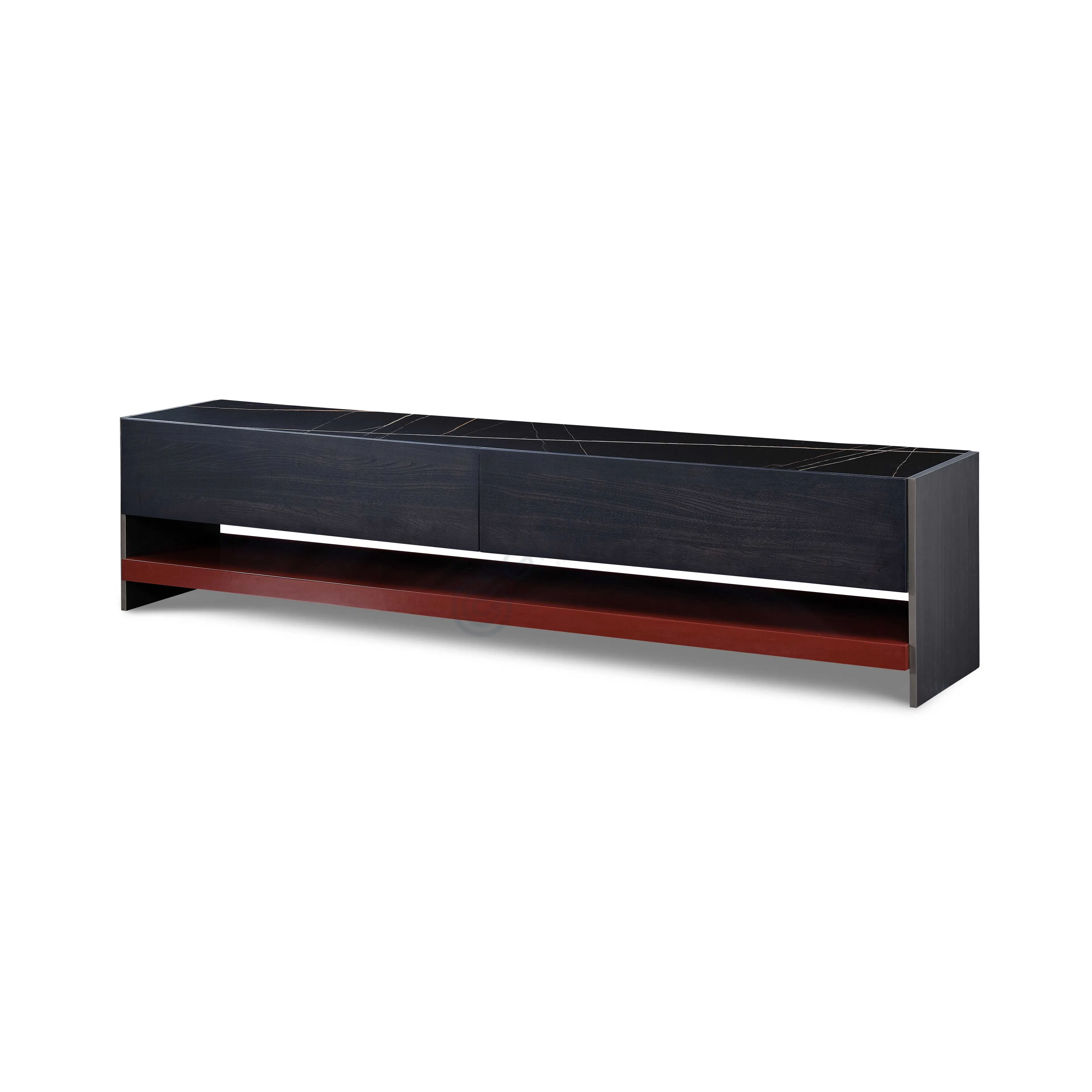 Practicality is key with a discreet drawer at the top, finished in the matching dark veneer. Beneath, an open shelf introduces a striking contrast with its bold red surface, offering easy access and a touch of visual interest.