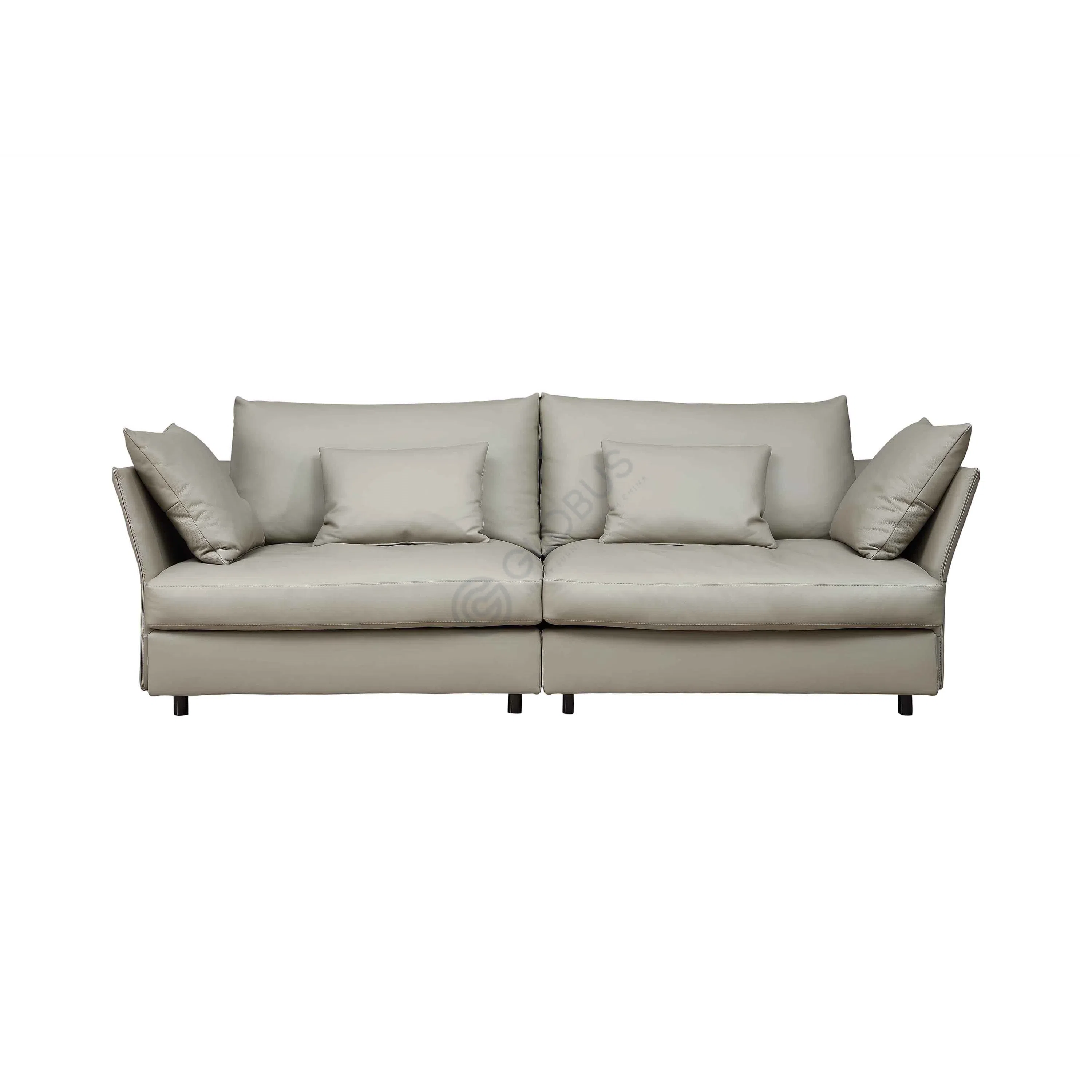Crafted with a robust internal structure combining solid wood and metal, this sofa provides lasting stability. The seating is generously filled, utilizing feather for a soft, inviting comfort that encourages relaxation. Additional plush back cushions enhance the supportive feel.