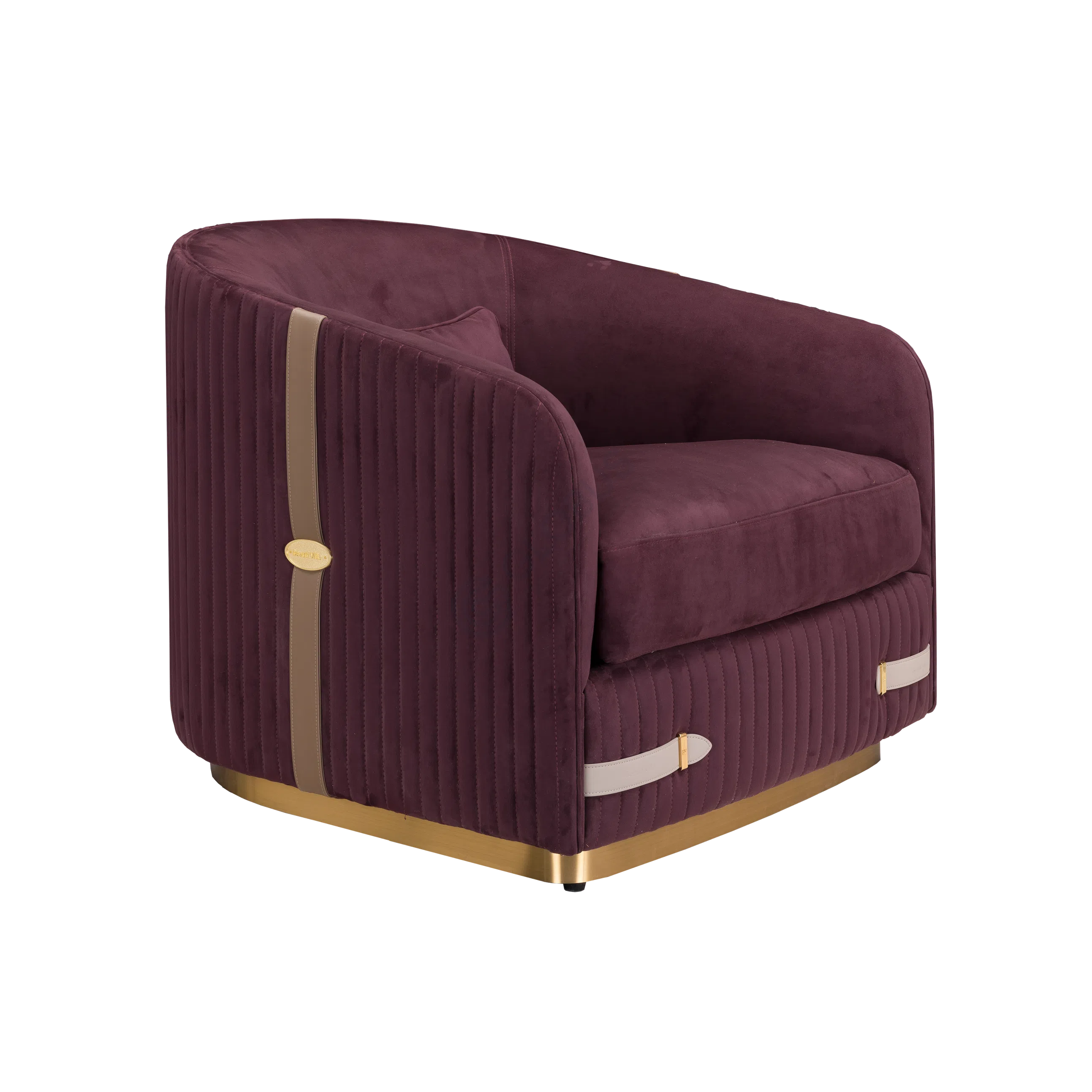 Subtle design elements enhance its appeal. The arms feature a tailored look with a unique ribbed texture on the side panel and a decorative strap detail, adding visual interest without overwhelming the minimalist form. Plush seat and back cushions provide a welcoming place to relax, combining comfort with enduring style.
