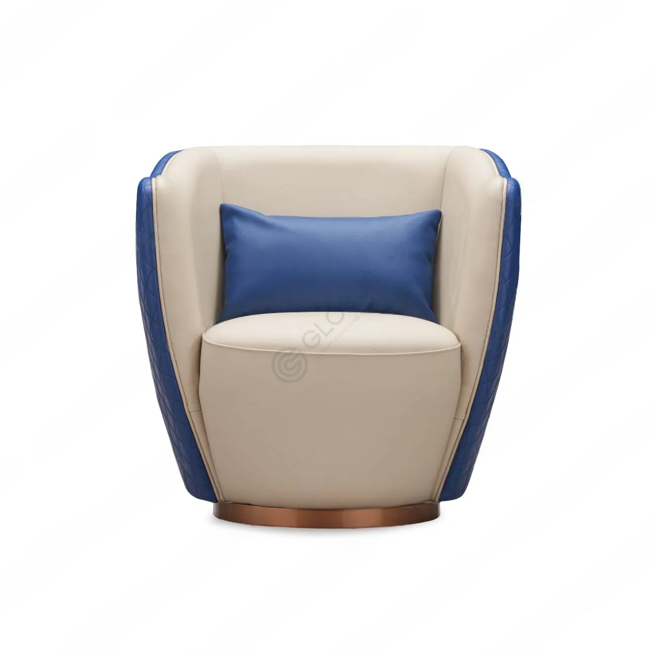 This modern sofa presents a sophisticated profile, blending clean lines with subtle curves. The main body is upholstered in a smooth, neutral-toned microfiber leather, providing a versatile base. It is elegantly framed by accent panels and cushions in a rich blue, adding a distinct visual highlight. The design is elevated by touches of gold-toned metal visible at the base, contributing a hint of luxury.
