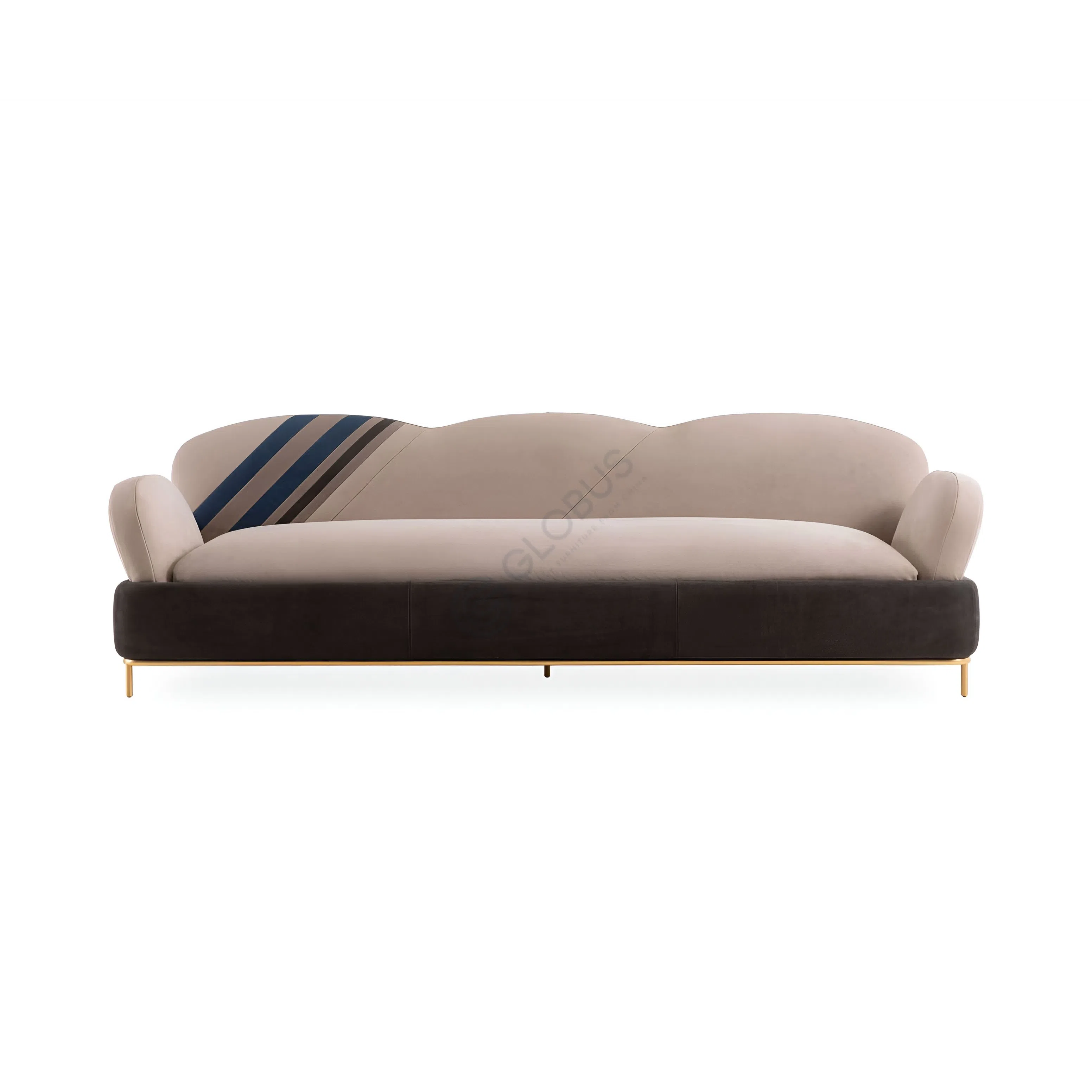 Below the serene blue, the base introduces a striking visual element with its bold vertical stripes. This dynamic textile pattern in contrasting dark and light tones provides a sophisticated foundation. The entire structure rests gracefully upon a slender frame of polished stainless steel, finished in a warm golden hue, lending an air of lightness and refined elegance. The robust internal construction, combining solid wood and plywood, ensures lasting durability and stability.