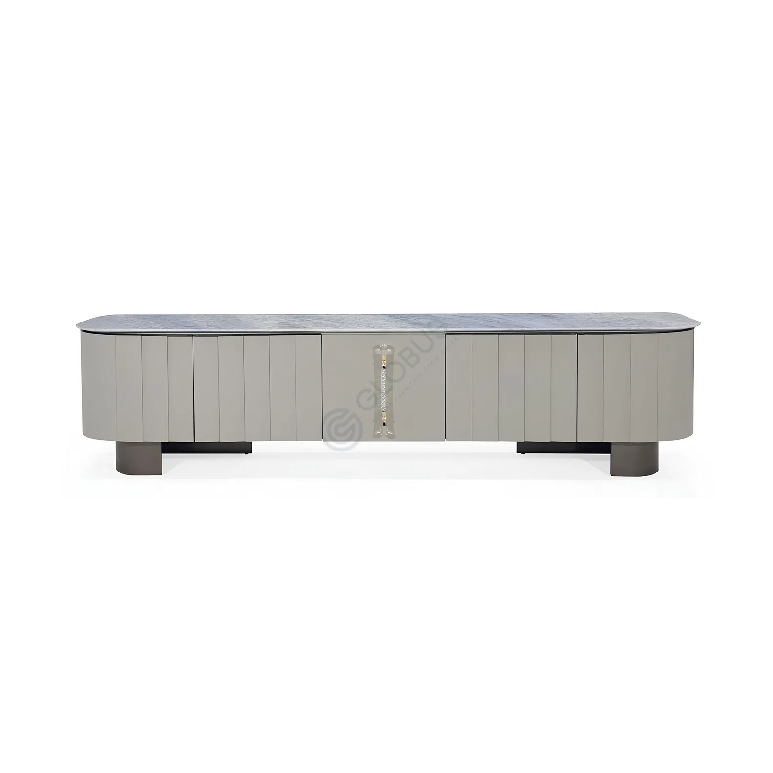 A streamlined sideboard in muted teal eco-suede showcases gentle curves along its fluted doors and rounded ends. A pale stone-effect top rests on a slim profile, while a dark stainless steel plinth provides stable support and a subtle metallic contrast.