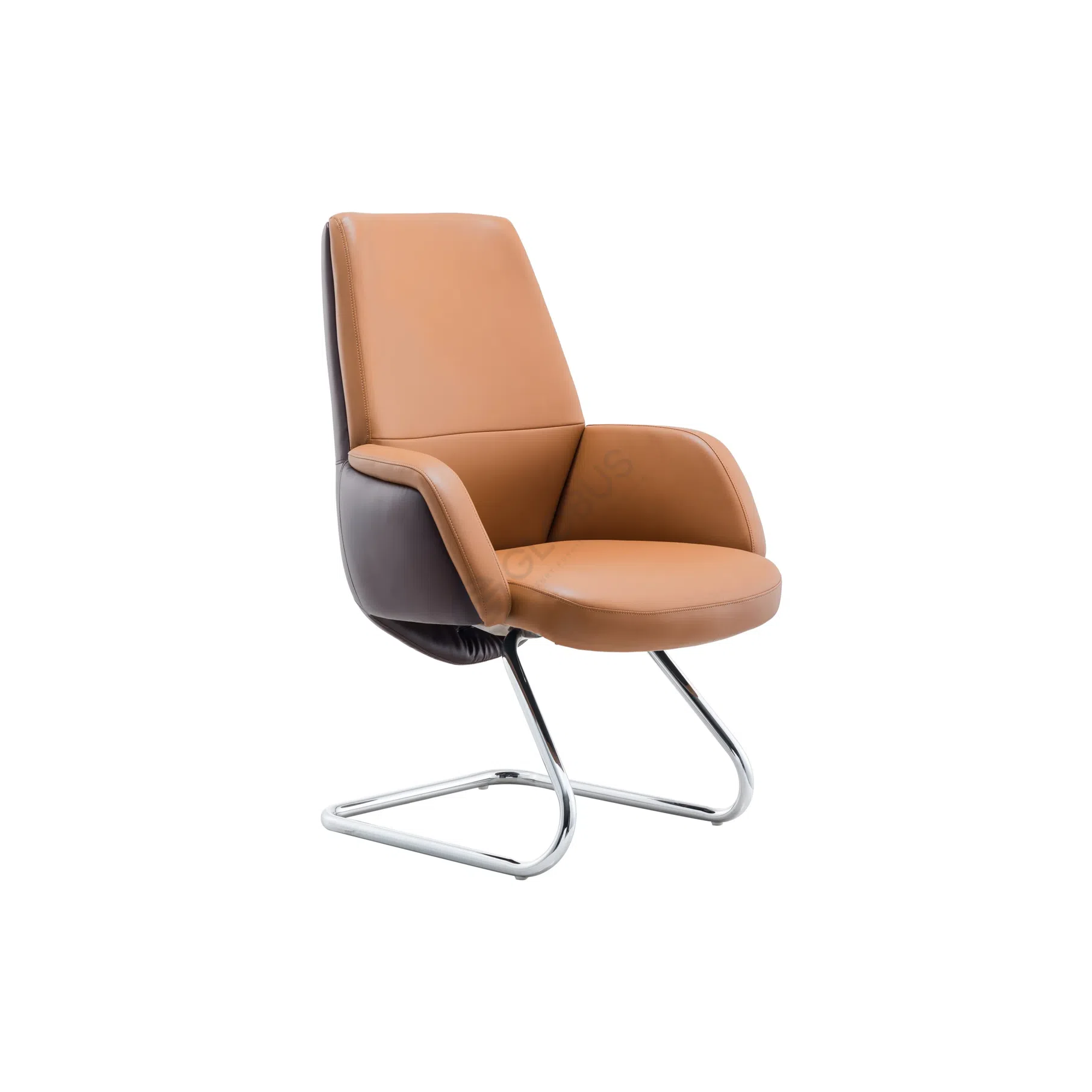 This office armchair presents a refined modern design, perfect for enhancing a home office environment. Its elegant profile combines a high back with smoothly integrated armrests, creating a sophisticated and inviting silhouette. The two-tone upholstery, featuring a warm tan over the main surfaces and a darker accent on the sides and arm details, adds visual depth and a touch of executive style.