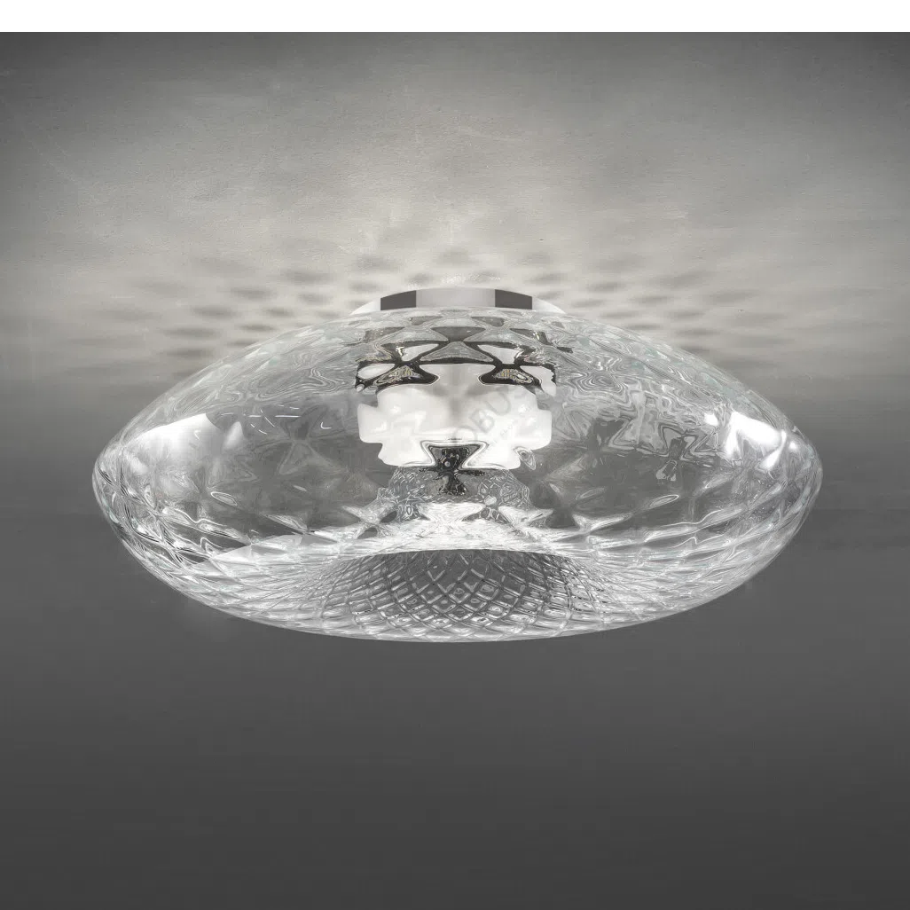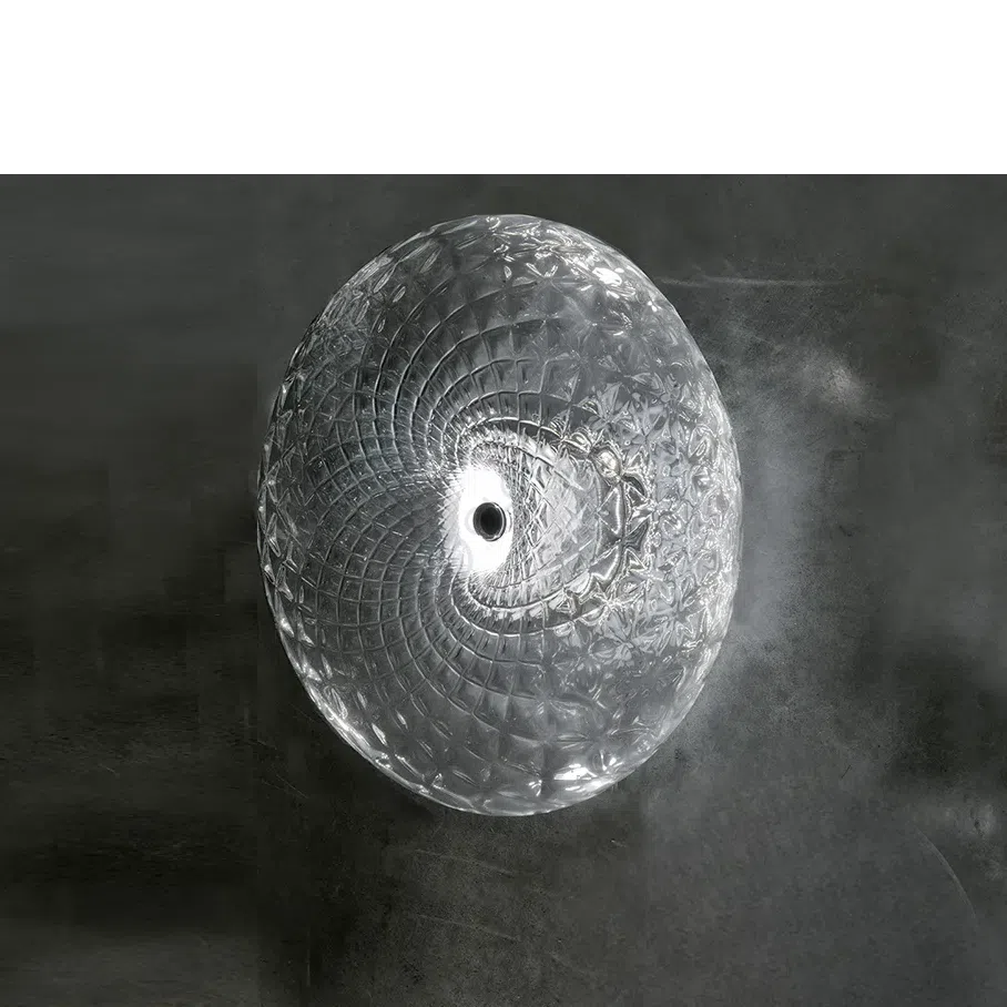 The focal point is the clear glass shade, crafted with a rich, faceted pattern. This texture allows light to refract beautifully, creating intriguing visual effects and a diffused, atmospheric glow when illuminated. The shape is both substantial and elegant, providing a contemporary profile.