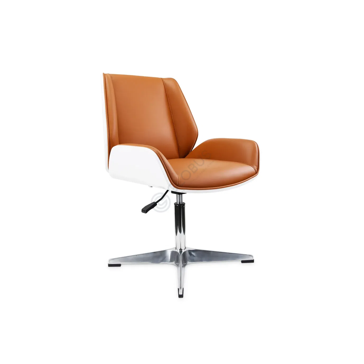 This office armchair presents a sophisticated profile, ideal for a modern workspace. Its design features a high back with integrated headrest shaping, offering a supportive structure that flows elegantly into gently sloped armrests. The rich tan PU upholstery provides a warm contrast against the crisp white outer shell, creating a striking visual balance.