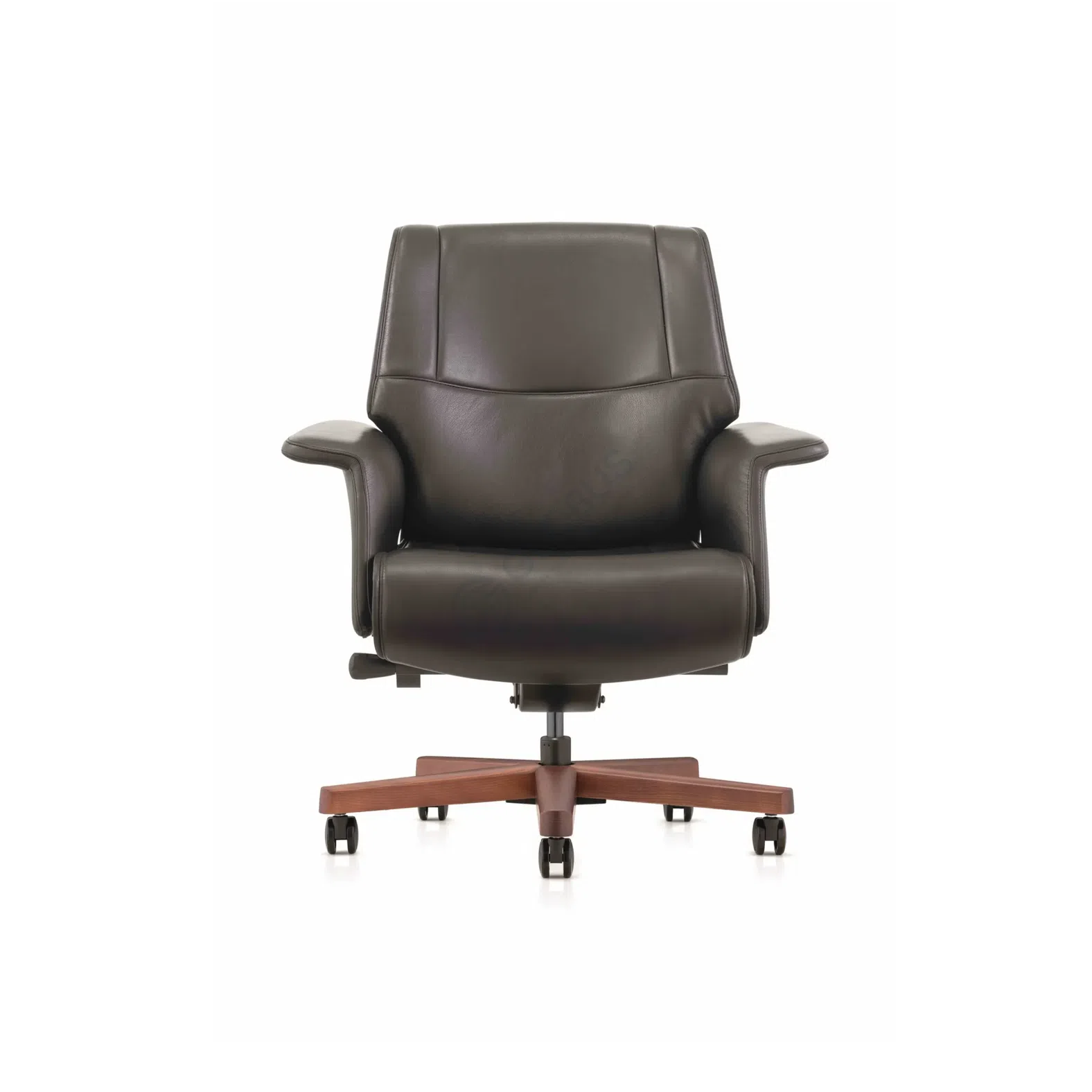 Beneath the elegant seat rests a sturdy base made from solid wood, adding a warm, natural contrast to the leather. This five-star base is fitted with smooth-rolling caster wheels, allowing for effortless movement across your workspace. An adjustable mechanism is seamlessly integrated, enabling you to personalize the chair's height and recline to suit your needs.