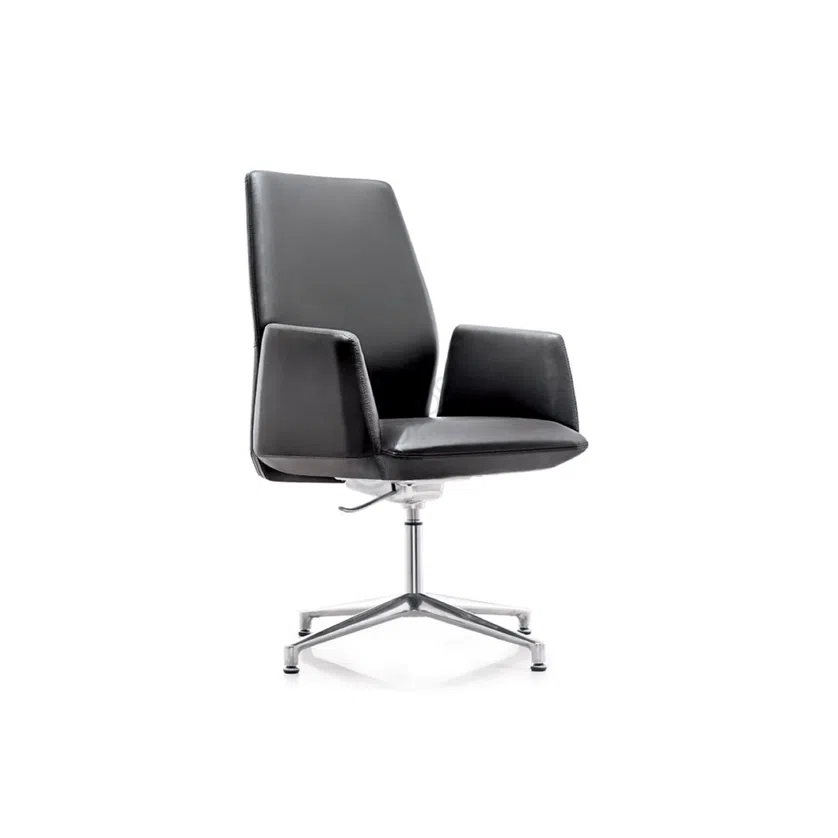 The base of the chair is constructed from polished aluminum, providing a sturdy foundation and a touch of modern elegance. This robust material ensures stability while contributing to the chair's overall stylish appearance. The design is focused on combining durable materials with a sophisticated finish suitable for a premium workspace.
