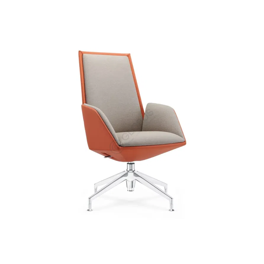 This modern office armchair presents a striking profile, blending contemporary form with inviting comfort. Its sleek silhouette, defined by clean lines and supportive contours, is upholstered in a sophisticated two-tone material combination. The backrest tapers elegantly upwards, complementing the subtly shaped arms that flow seamlessly from the seat.